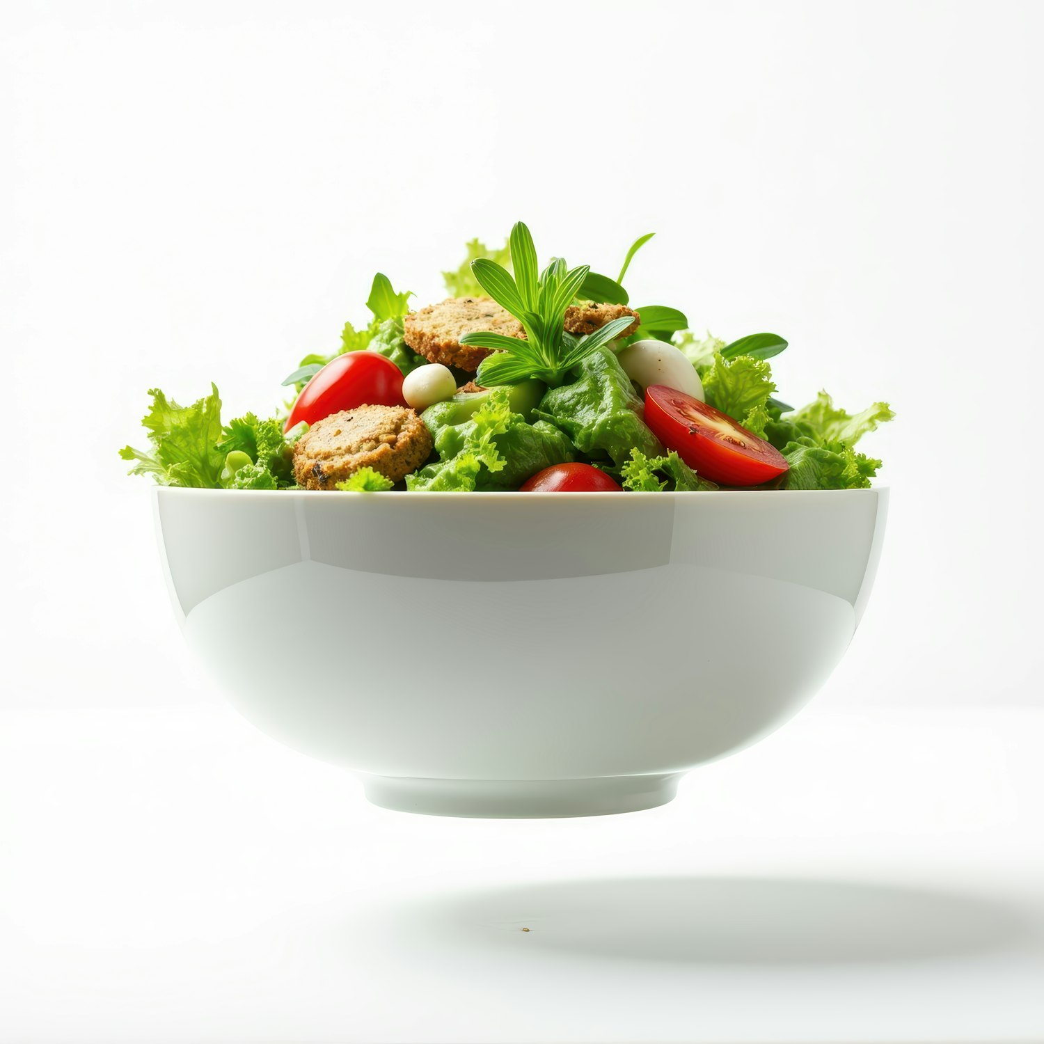 Fresh salad with lettuce, cherry tomatoes, mozzarella, and falafel in a white bowl, garnished with herbs. Vibrant and appetizing.