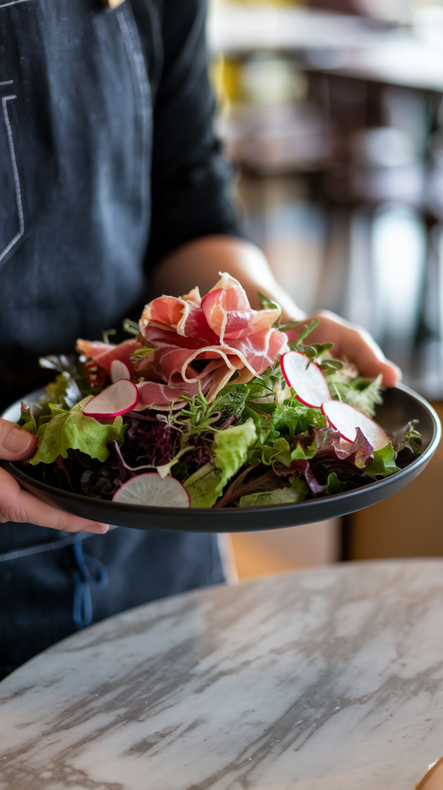 Fresh salad with prosciutto and radishes on a black plate, held by a person in a dark apron over a marble table.