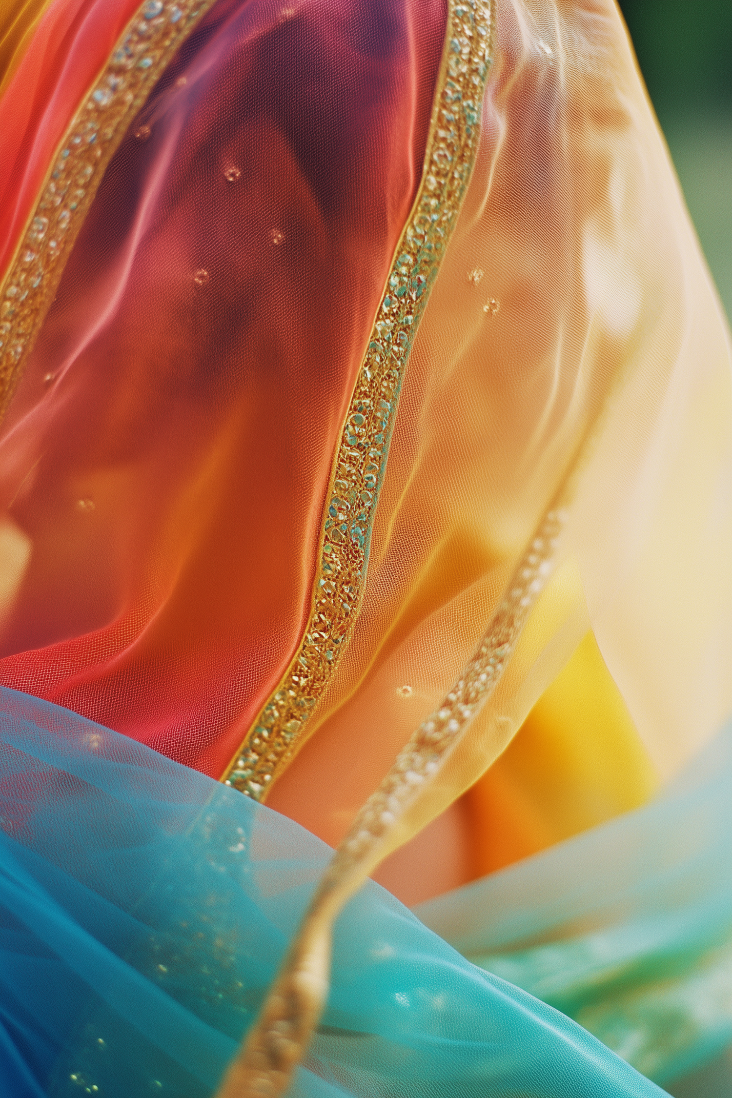 Vibrant multicolored fabric with gold embroidery and sparkling embellishments, showcasing rich reds, oranges, yellows, and blues.