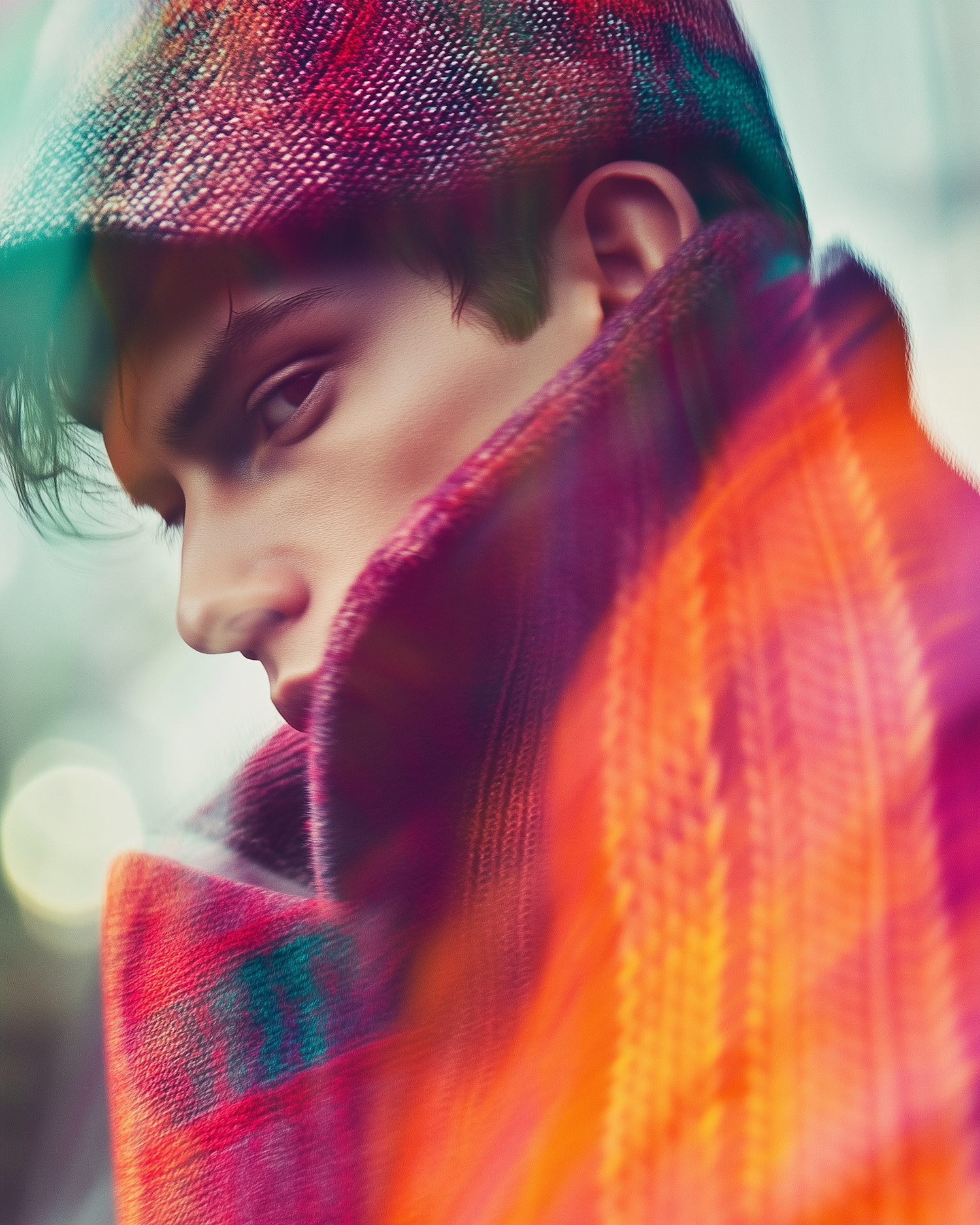 Close-up of a person in a colorful scarf and hat, with a mysterious gaze and vibrant colors creating a dynamic fashion portrait.