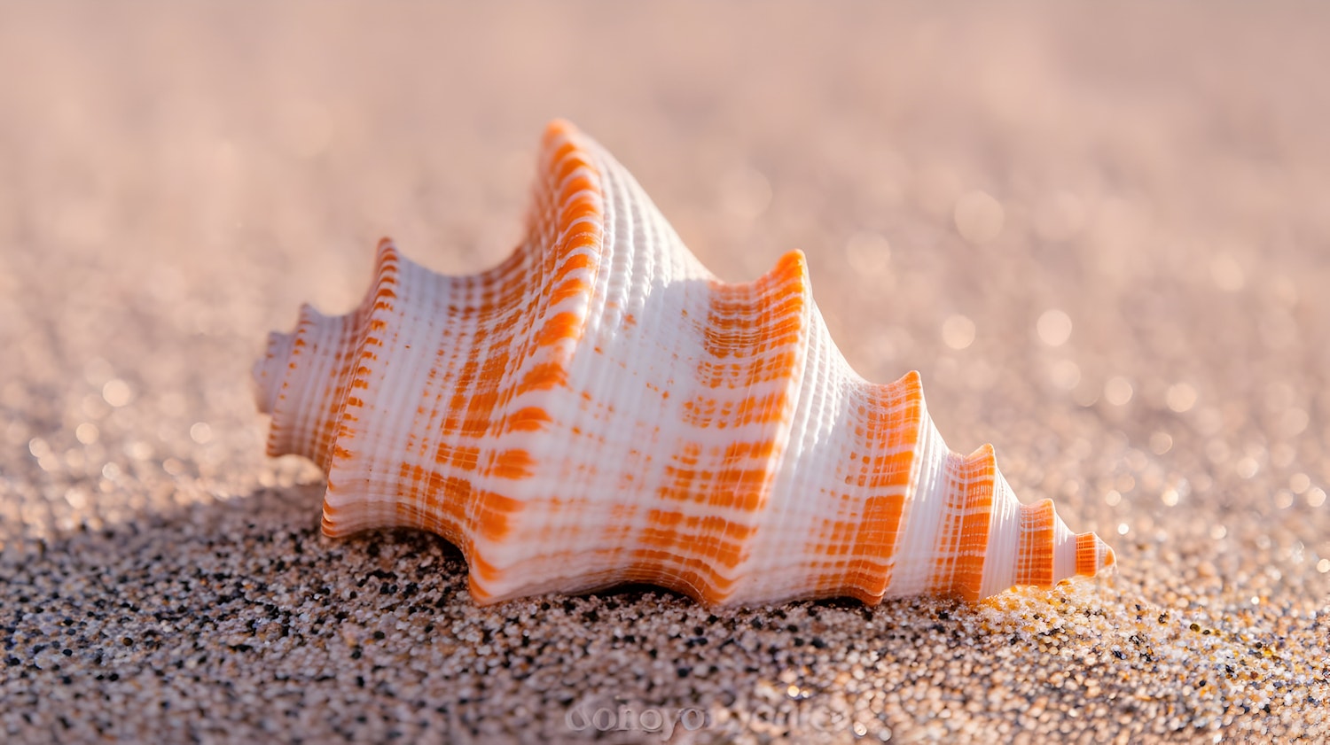 Close-up of a vibrant orange and white seashell on sandy beach, with soft sunlight and a blurred background for a serene vibe.