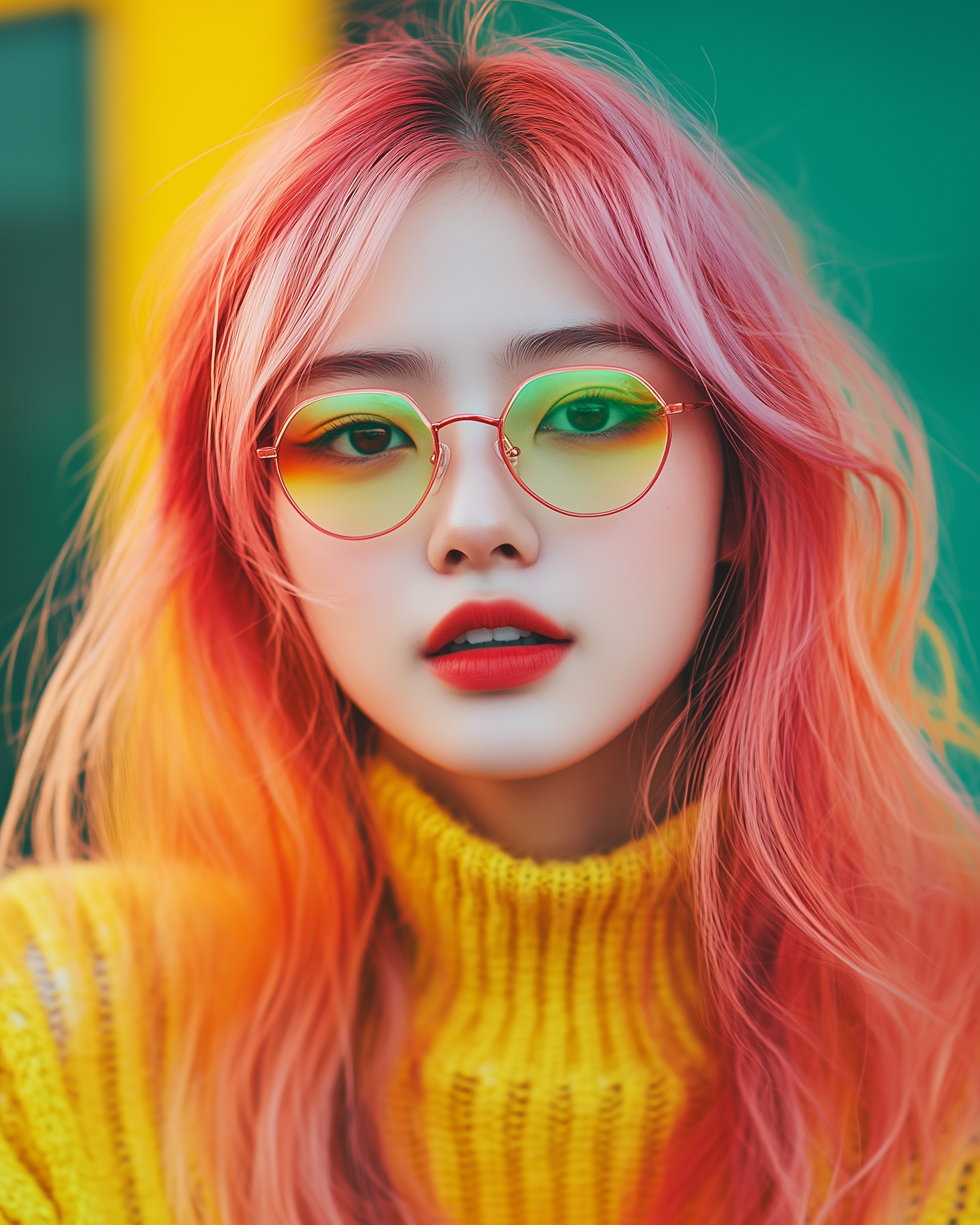 Vibrant portrait of a young woman with pink-orange hair, gradient sunglasses, red lips, and a yellow sweater against a colorful background.