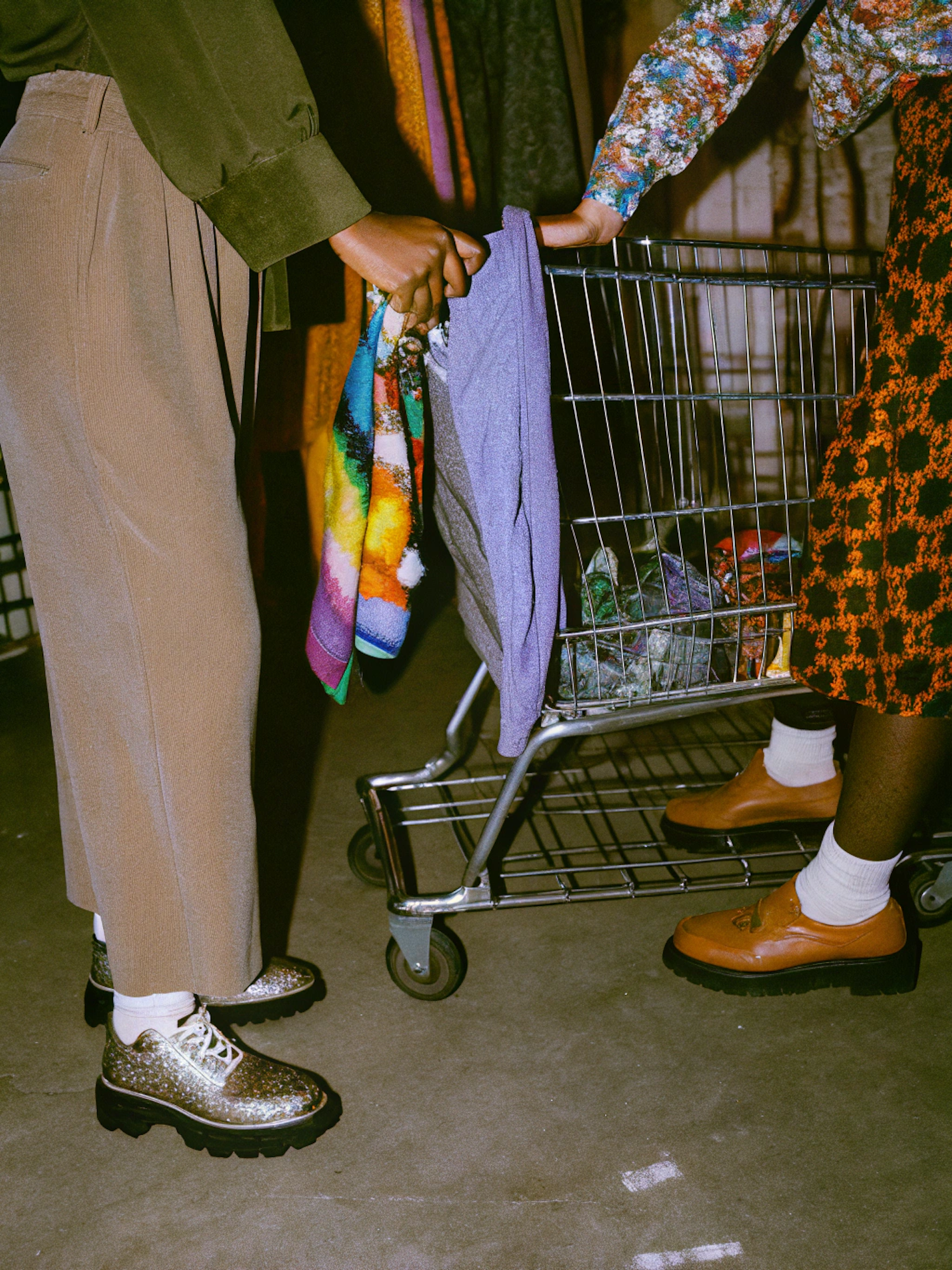 Two stylish individuals with vibrant outfits interact with a shopping cart filled with colorful fabrics in a dimly lit space.