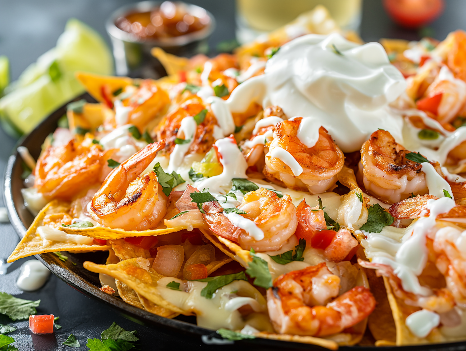 Delicious shrimp nachos topped with sour cream, cilantro, and tomatoes, served with lime wedges and salsa for a flavorful treat.
