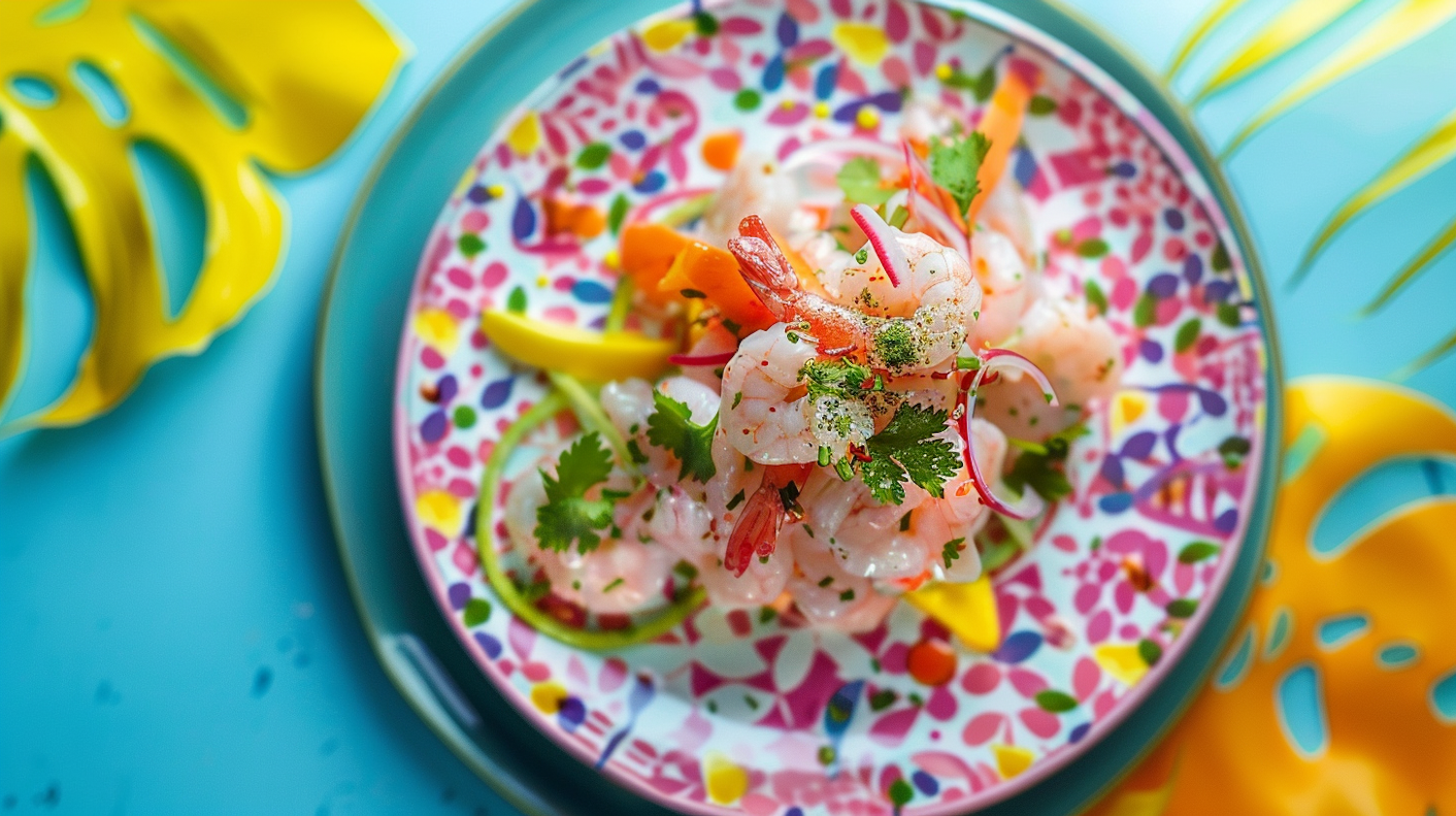 Colorful shrimp ceviche with mango and cilantro on a vibrant patterned plate, set against a turquoise background.