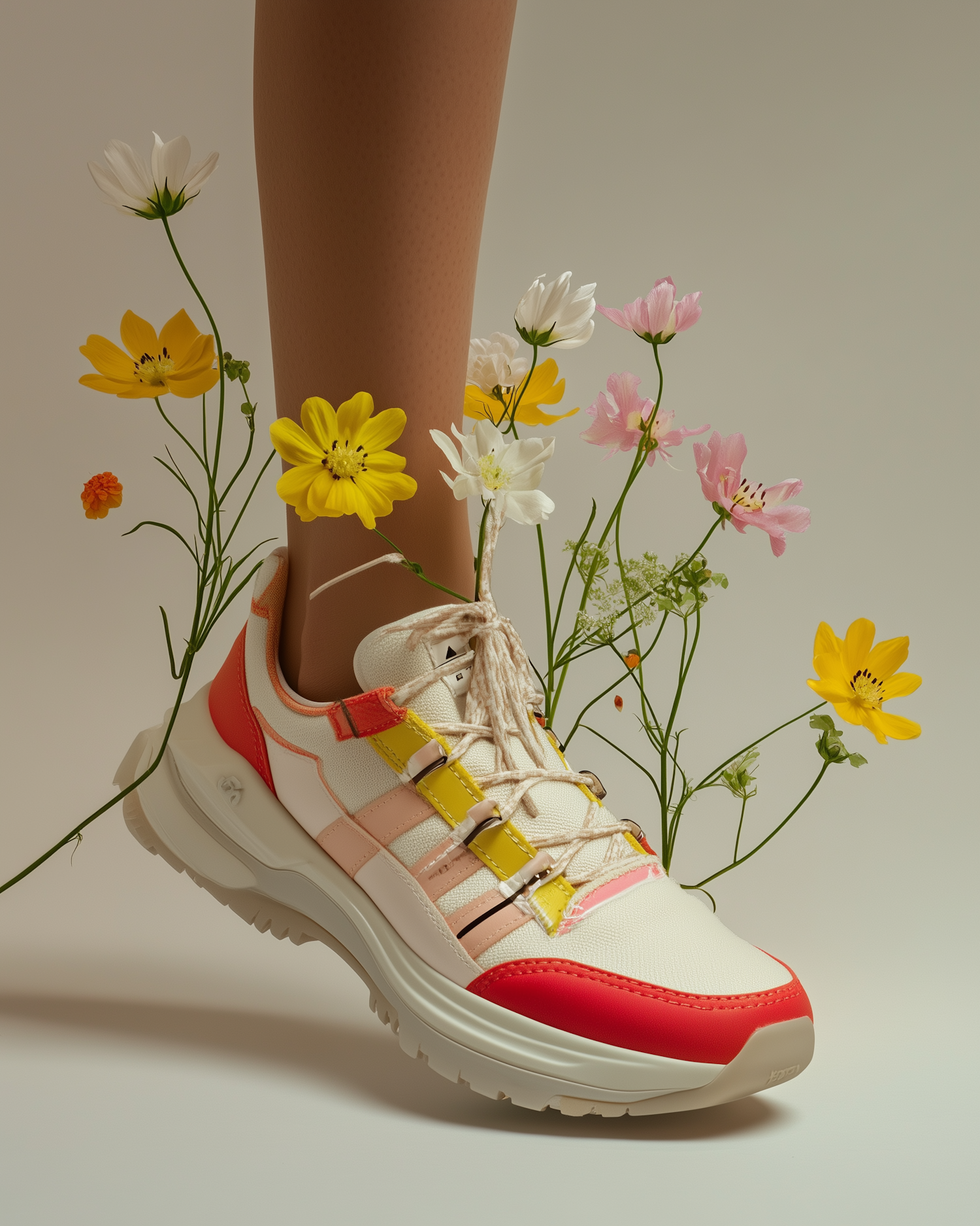 Stylish sneaker with colorful flowers, blending fashion and nature. Features white, red, and yellow accents on a neutral background.