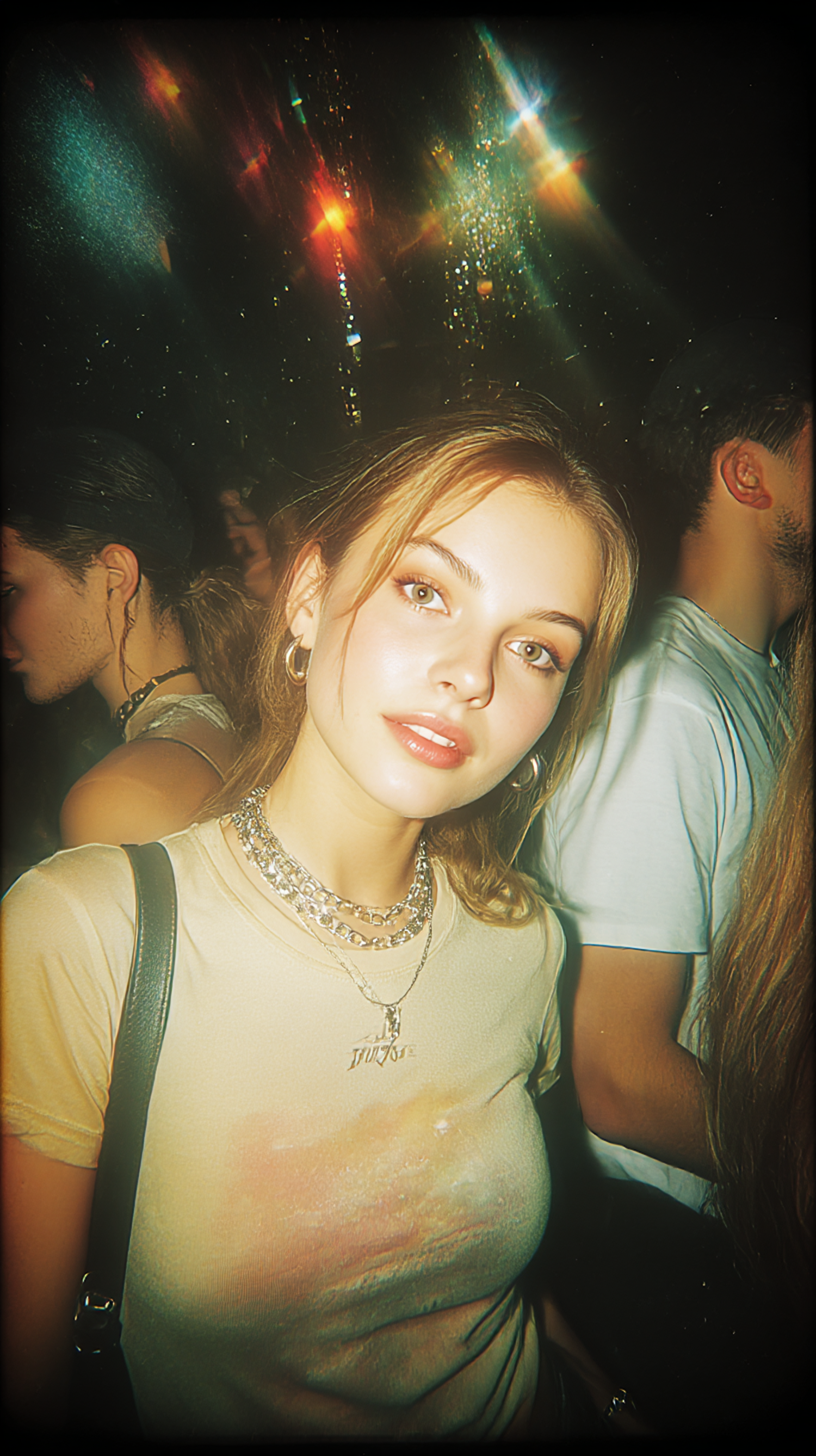 A young woman in a vibrant social setting, illuminated by colorful lights, wearing layered necklaces and a light t-shirt.