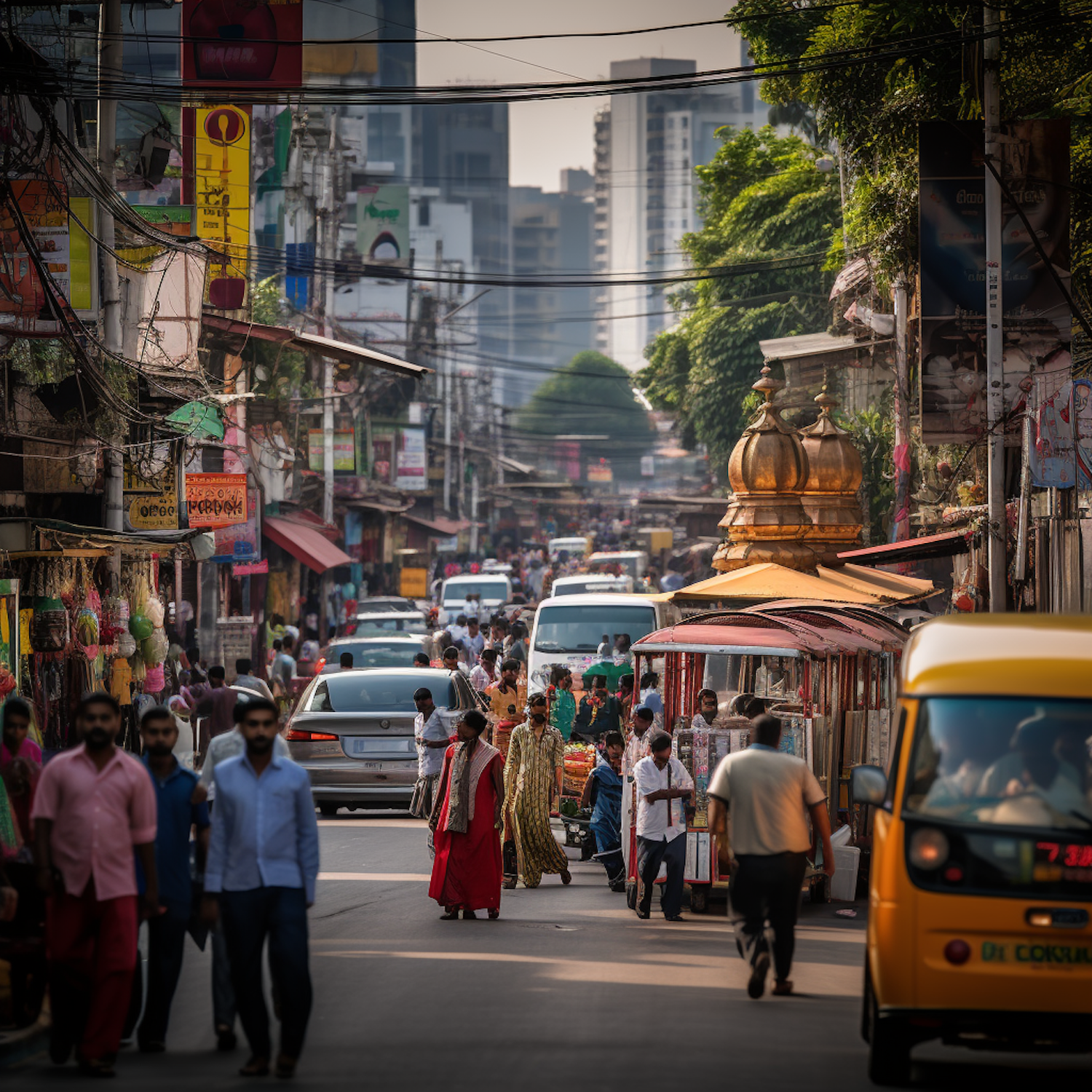 Bustling urban street with diverse crowd, colorful shops, and vehicles. Traditional and modern architecture blend in vibrant city life.