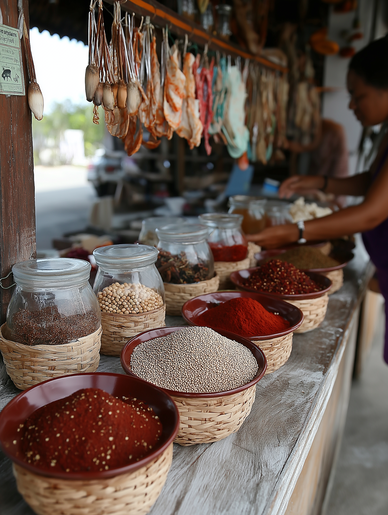 Rustic market stall with colorful spices in baskets, hanging dried goods, and a woman browsing in the background.
