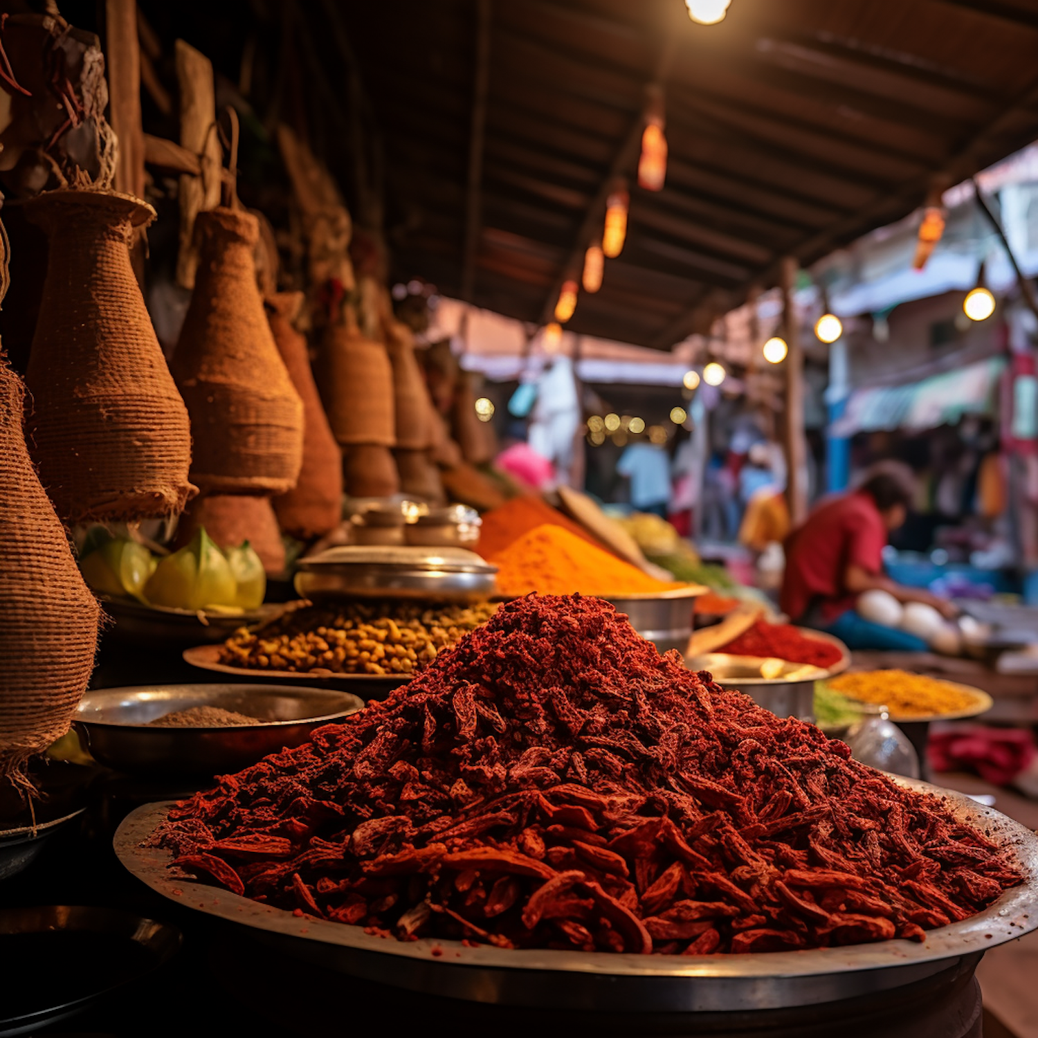 Vibrant market scene with colorful spices and woven baskets, creating a lively and traditional atmosphere.