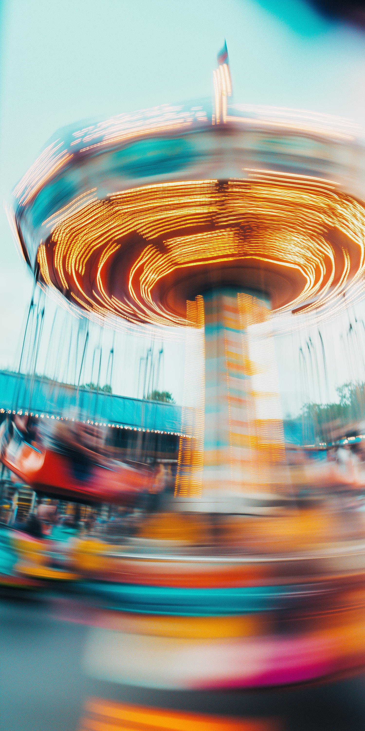 Blurred carousel with bright lights and colorful seats in motion, creating a dynamic and lively amusement park scene.