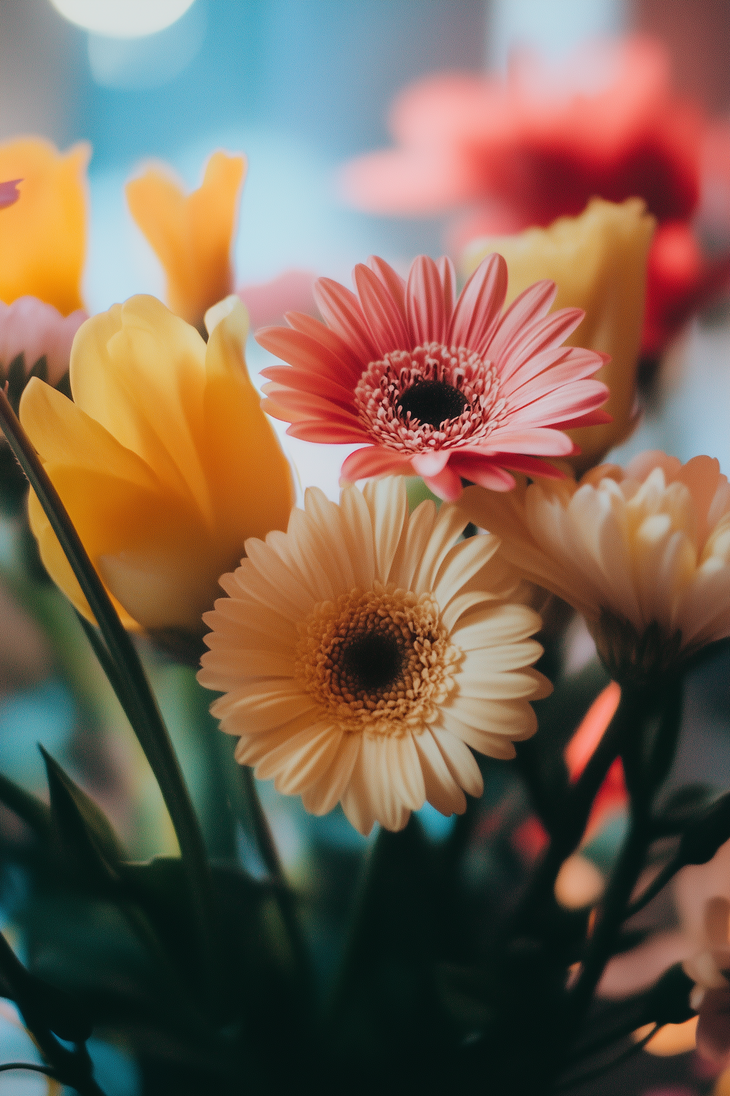 Vibrant bouquet with pink gerbera, yellow tulips, and cream daisies. Soft lighting and blurred background enhance the floral beauty.
