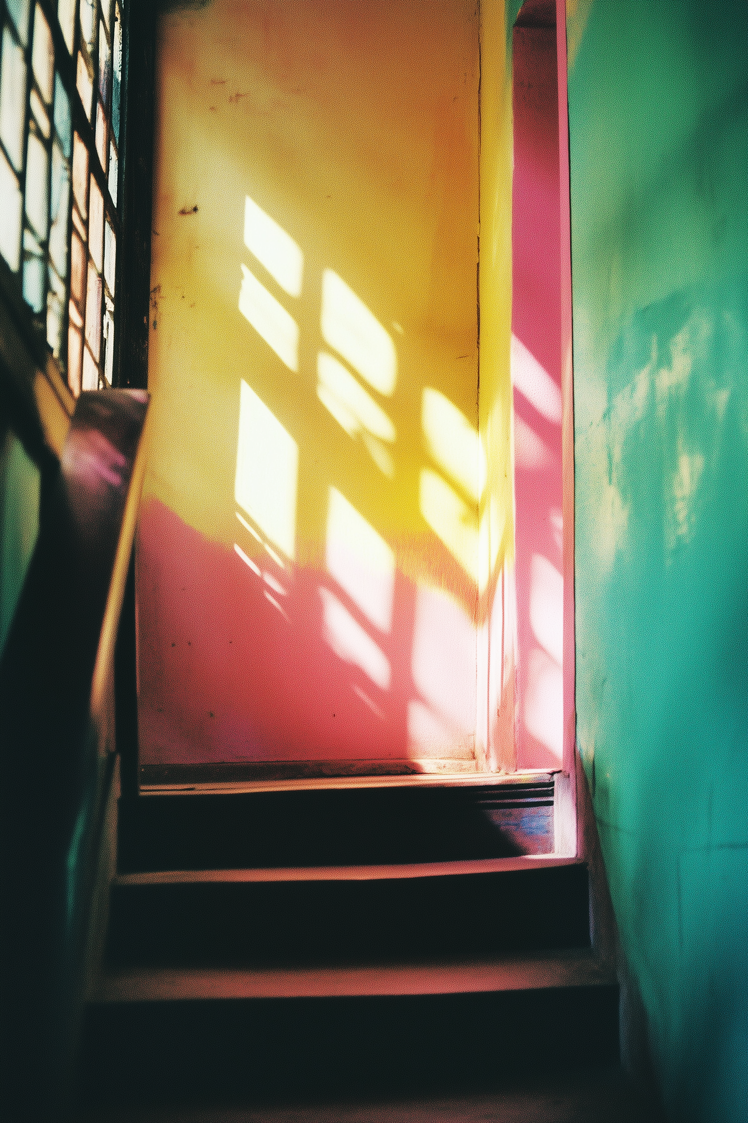 Colorful staircase with sunlight casting geometric shadows on vibrant walls. Artistic stained glass window adds flair.