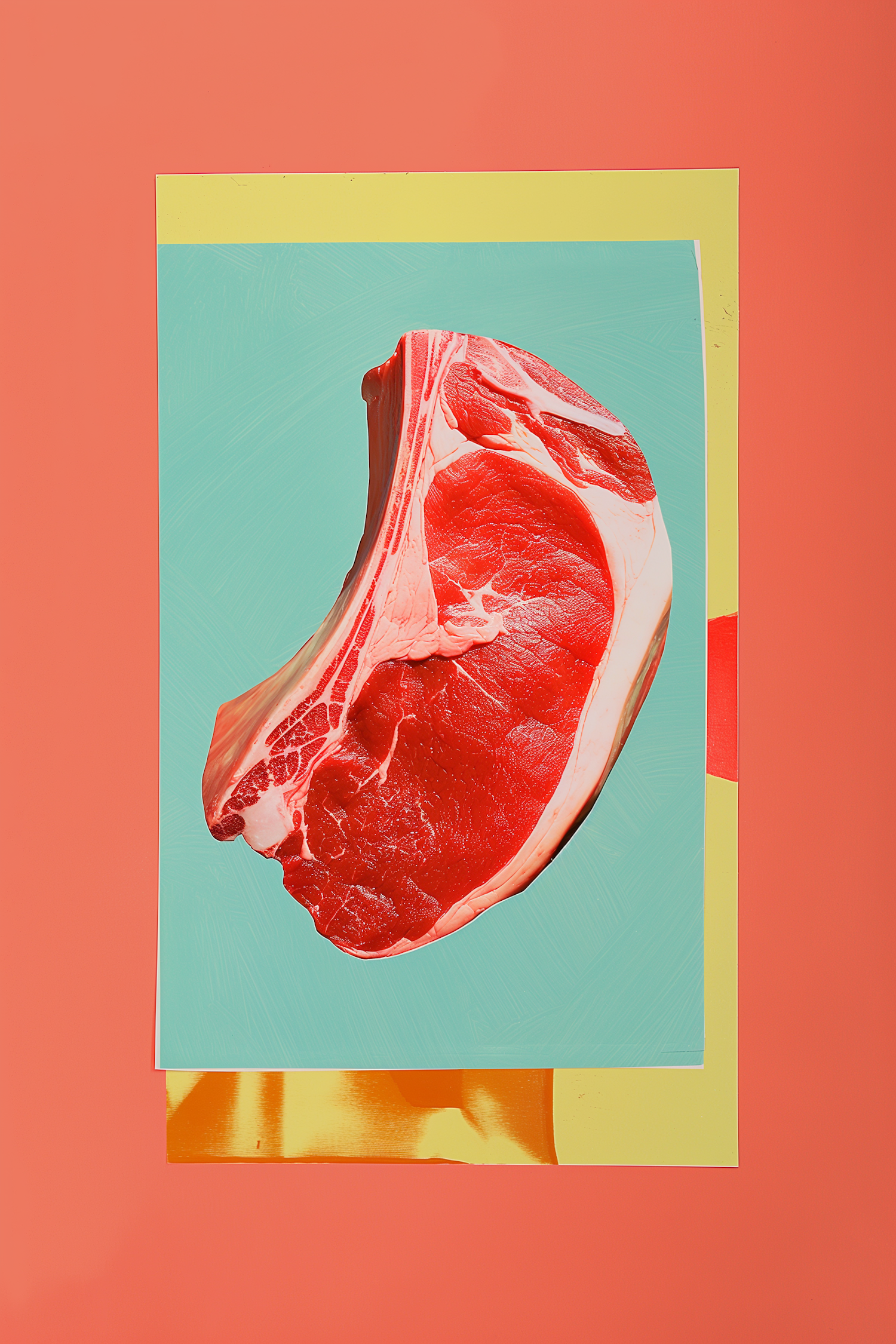 Artistic composition of a raw steak on a colorful background with teal, yellow, and coral layers, creating a modern pop-art feel.
