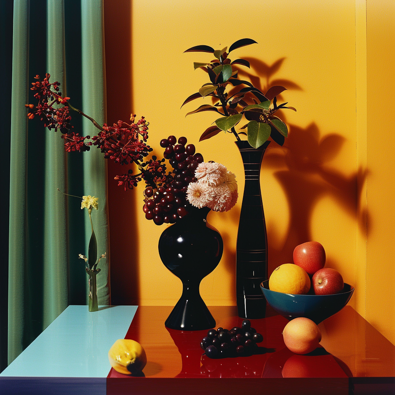 Vibrant still life with colorful fruits, flowers, and vases against a bold yellow and green backdrop.
