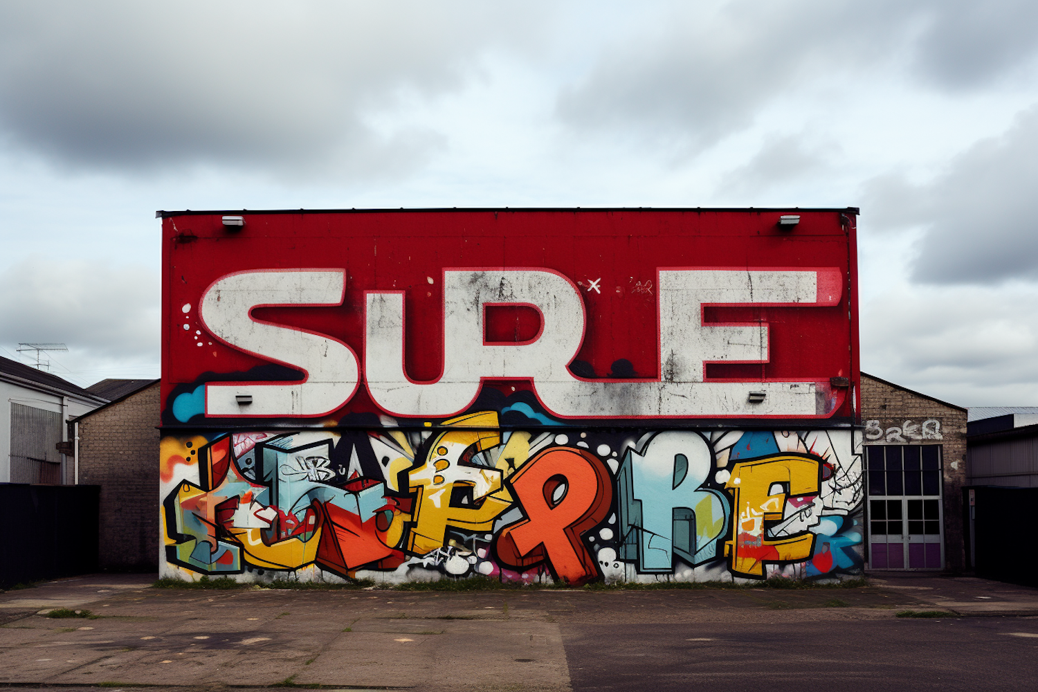 Urban building with bold 'SURE' graffiti and colorful street art on a red facade under a cloudy sky.