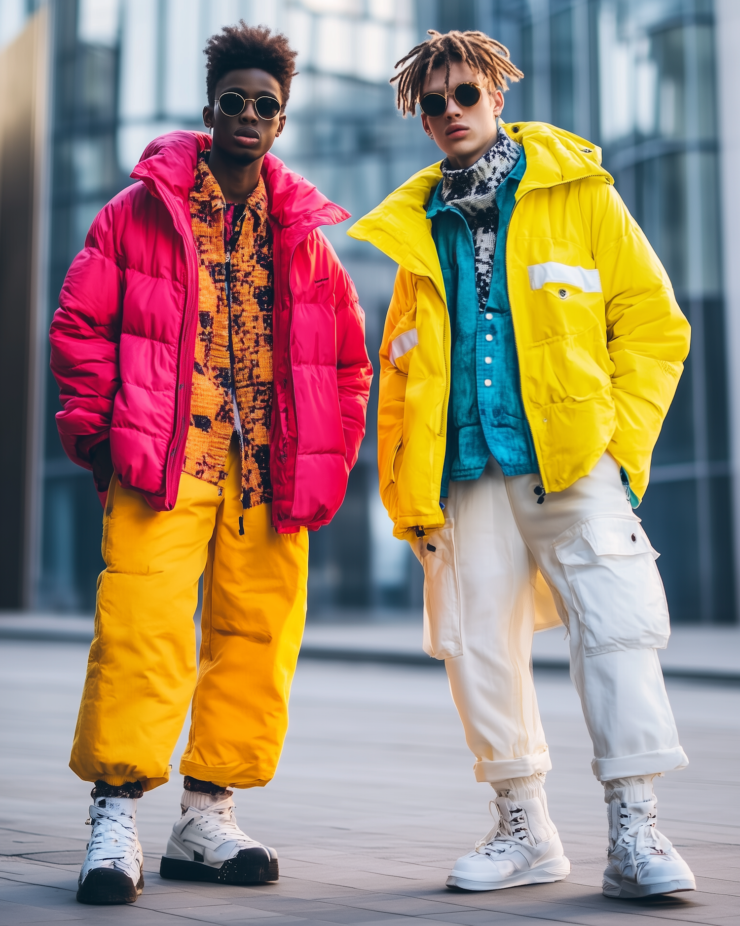 Two stylish men in vibrant puffer jackets and streetwear pose confidently in an urban setting.