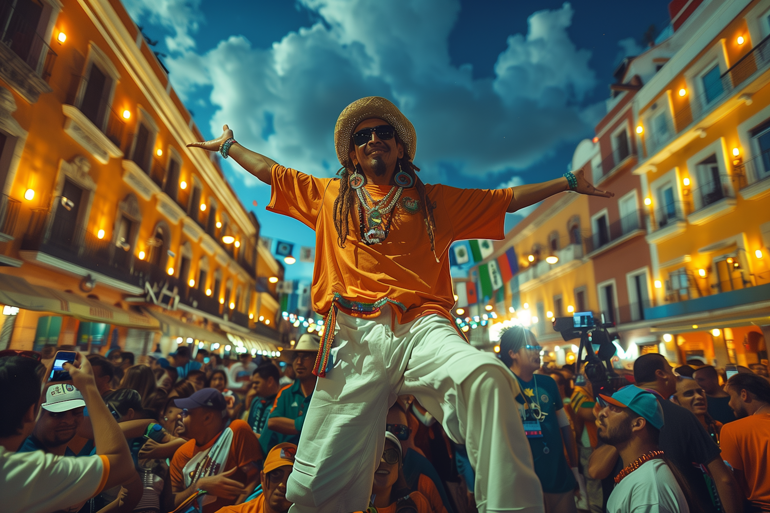 Festive street scene with a joyful man in orange, surrounded by a lively crowd and colorful buildings under a vibrant sky.