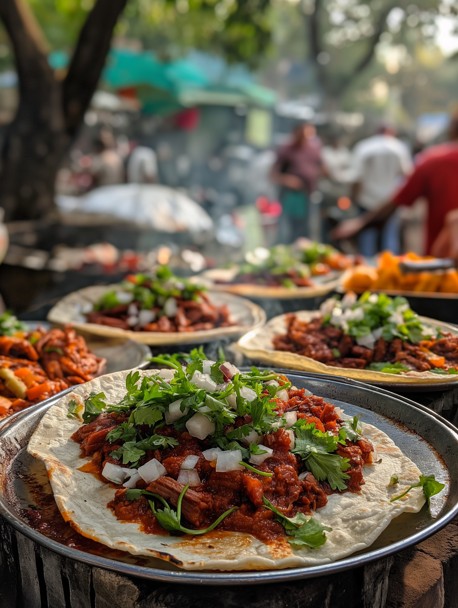 Delicious street tacos with rich toppings in a bustling market setting, featuring fresh cilantro and onions on charred tortillas.
