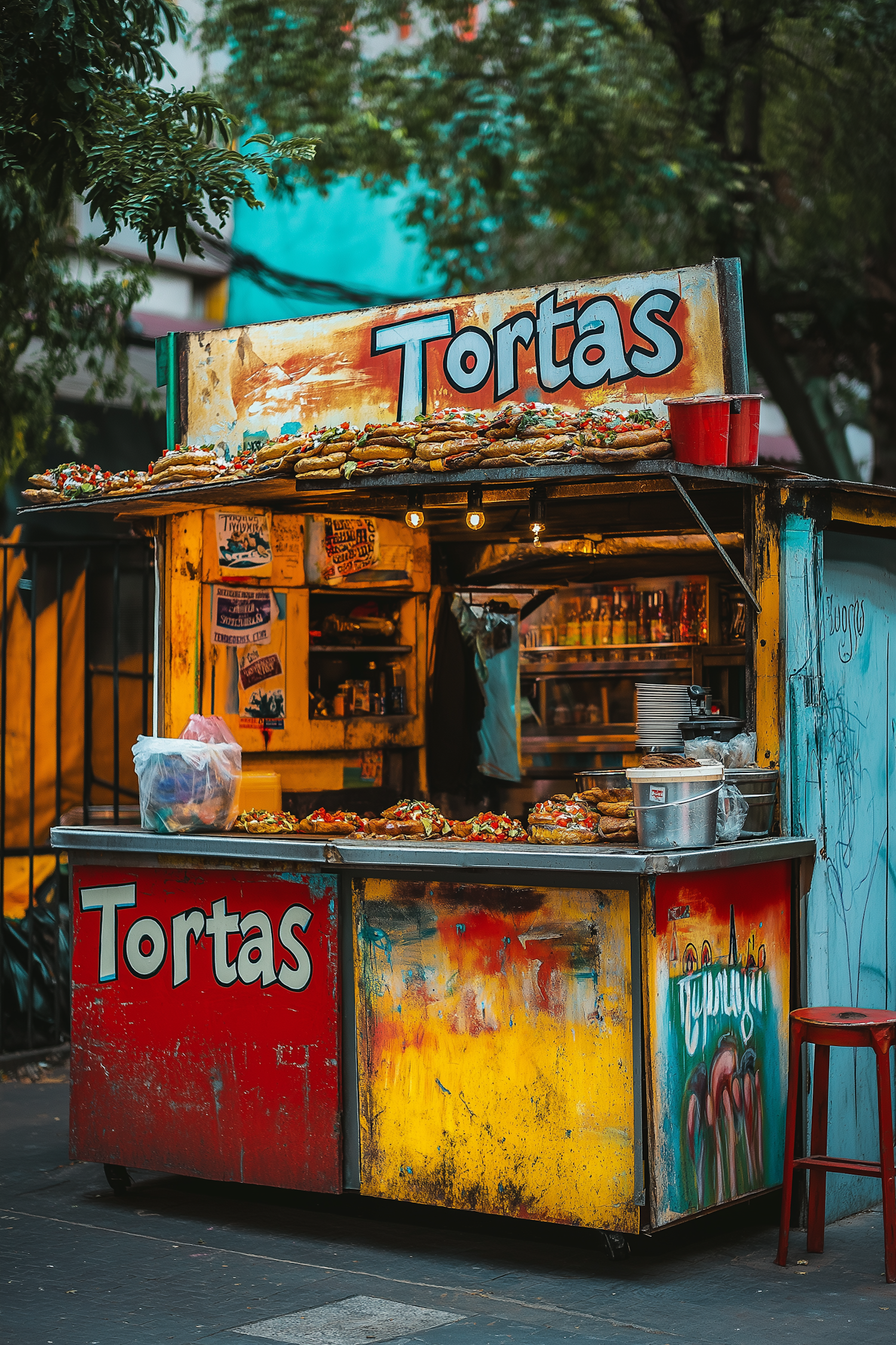 Colorful street food stall selling tortas with fresh ingredients, vibrant signage, and urban charm.