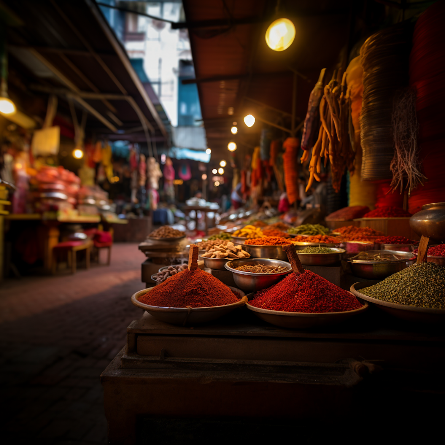 Vibrant spice market with colorful spices in bowls, warm lighting, and a bustling atmosphere.
