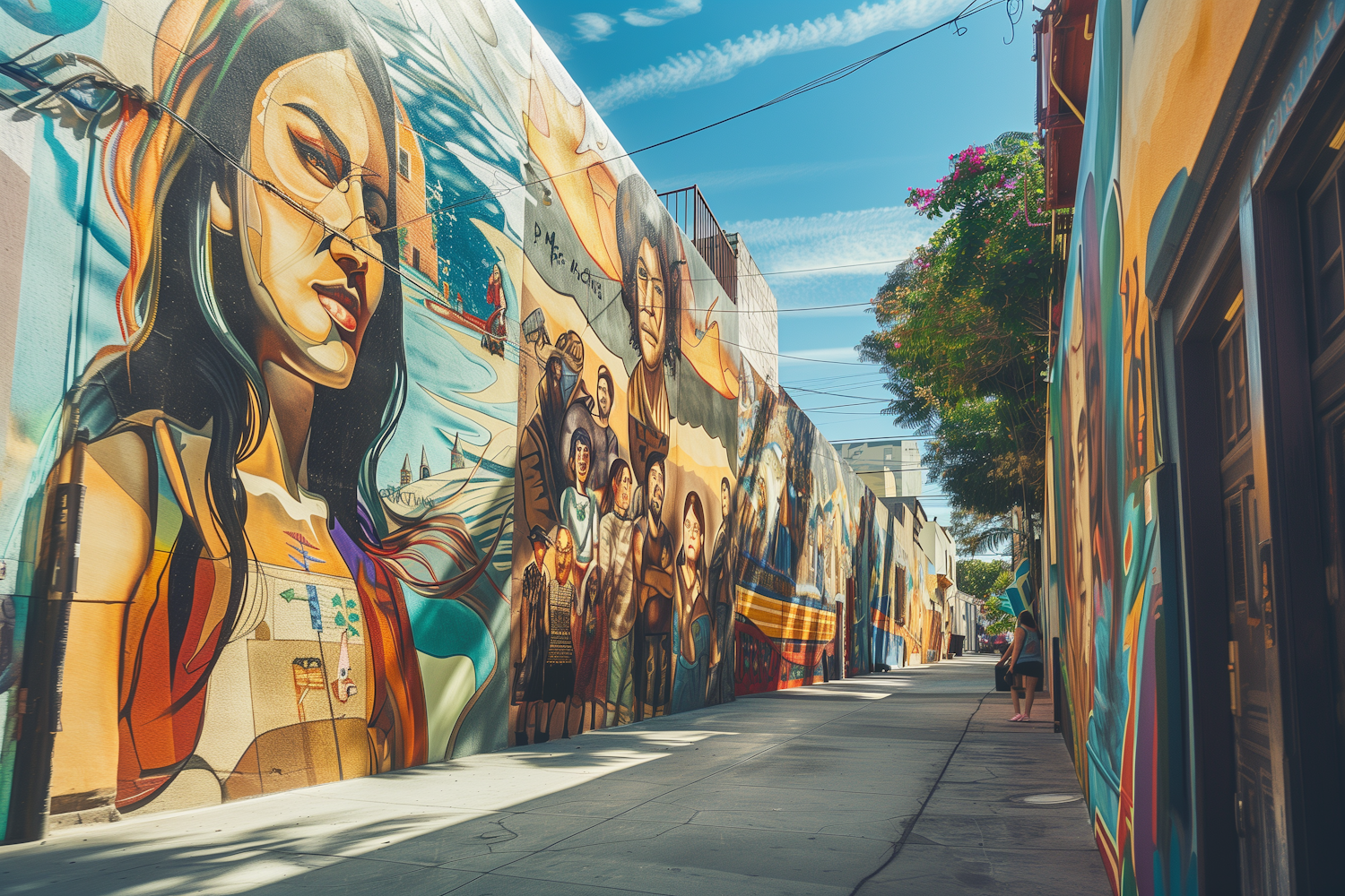 Colorful murals line a sunlit alley, featuring vibrant portraits and scenes. A striking mural of a woman with flowing hair stands out.