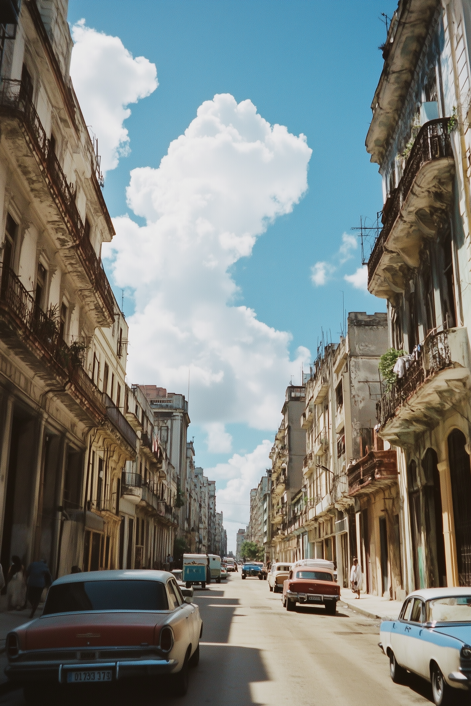 Classic cars and historic buildings line a vibrant city street under a bright blue sky with fluffy clouds.