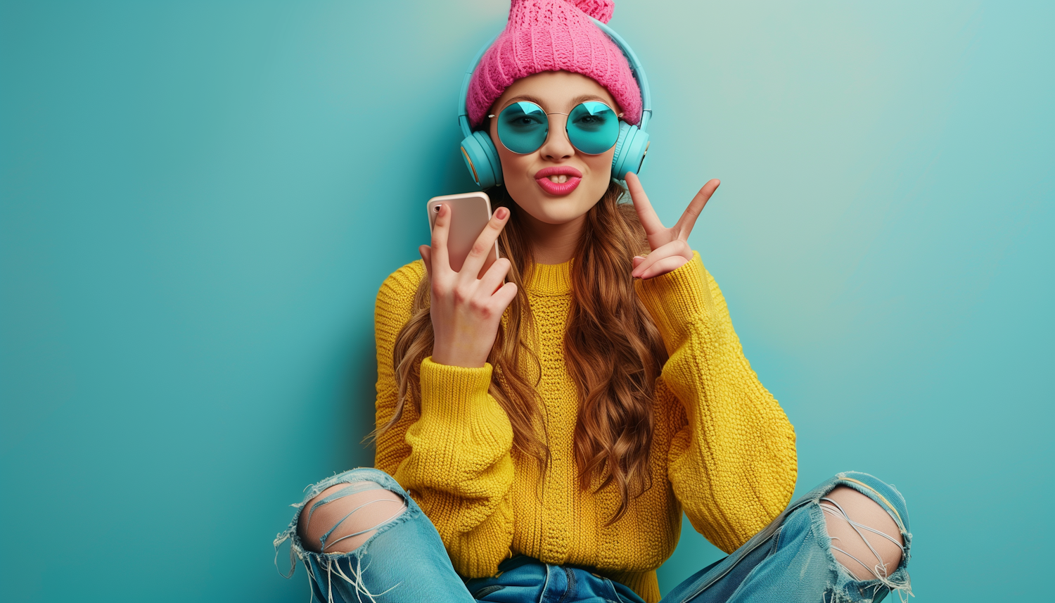Trendy young woman in colorful outfit with pink beanie and blue sunglasses, making a peace sign while holding a smartphone.