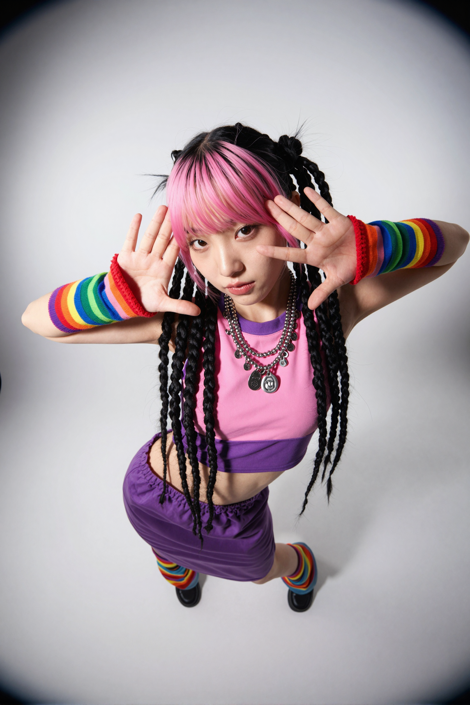 A vibrant portrait of a person with pink and black hair, colorful accessories, and a dynamic pose against a plain background.