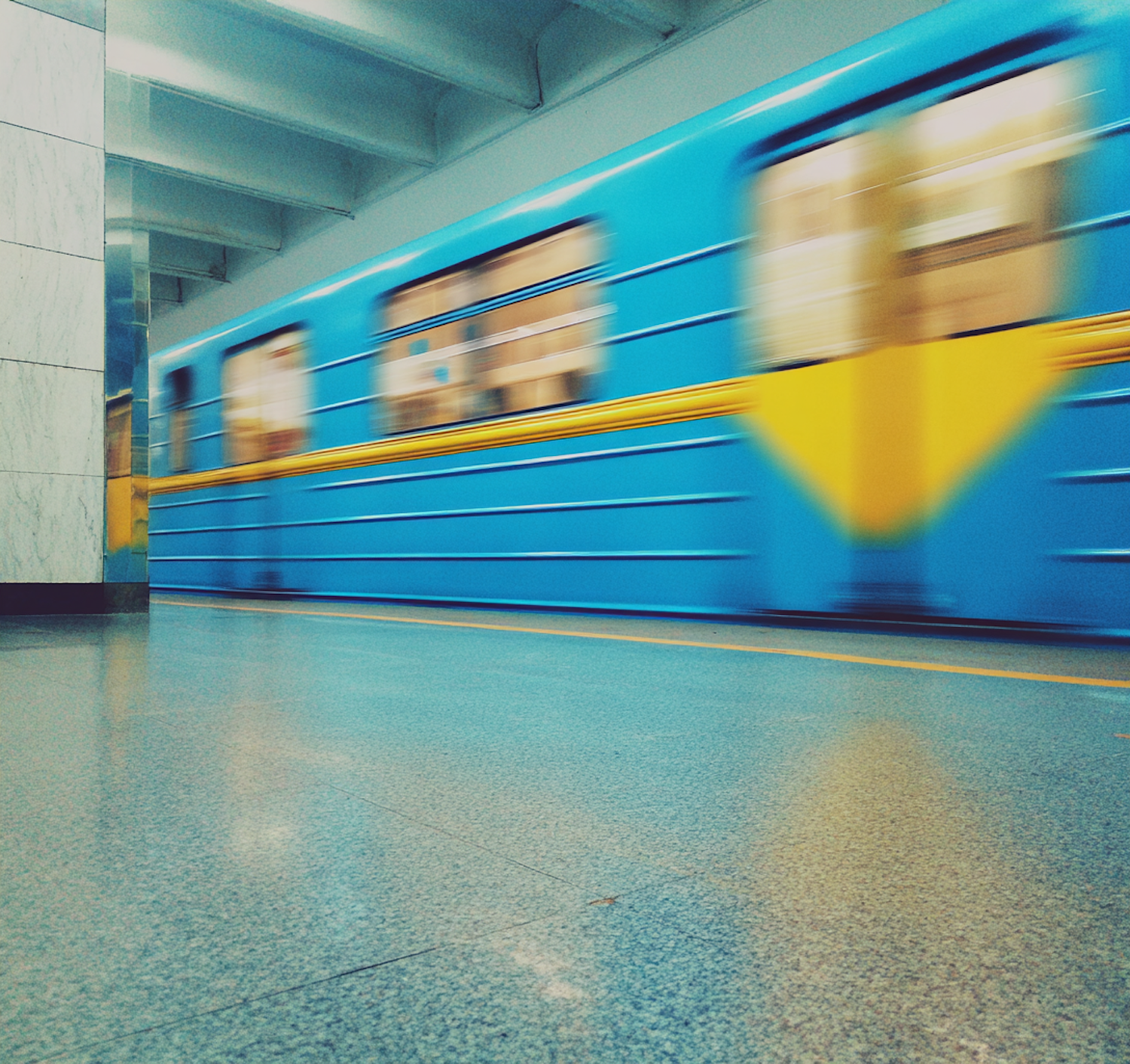 A vibrant blue and yellow subway train speeds through a modern station featuring reflective flooring and clean architectural lines.