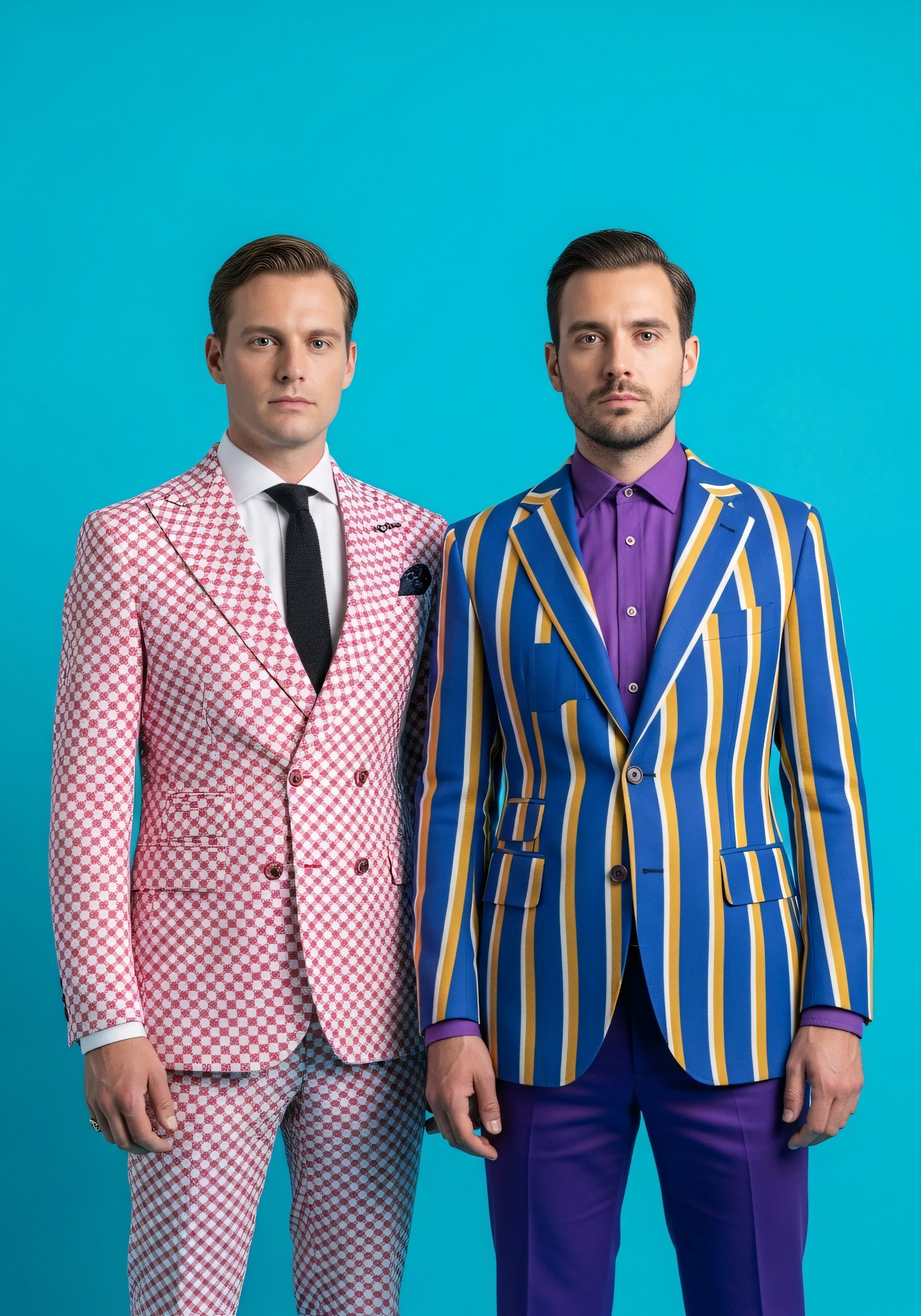 Two men in bold, colorful suits stand against a bright blue background, showcasing unique patterns and vibrant styles.