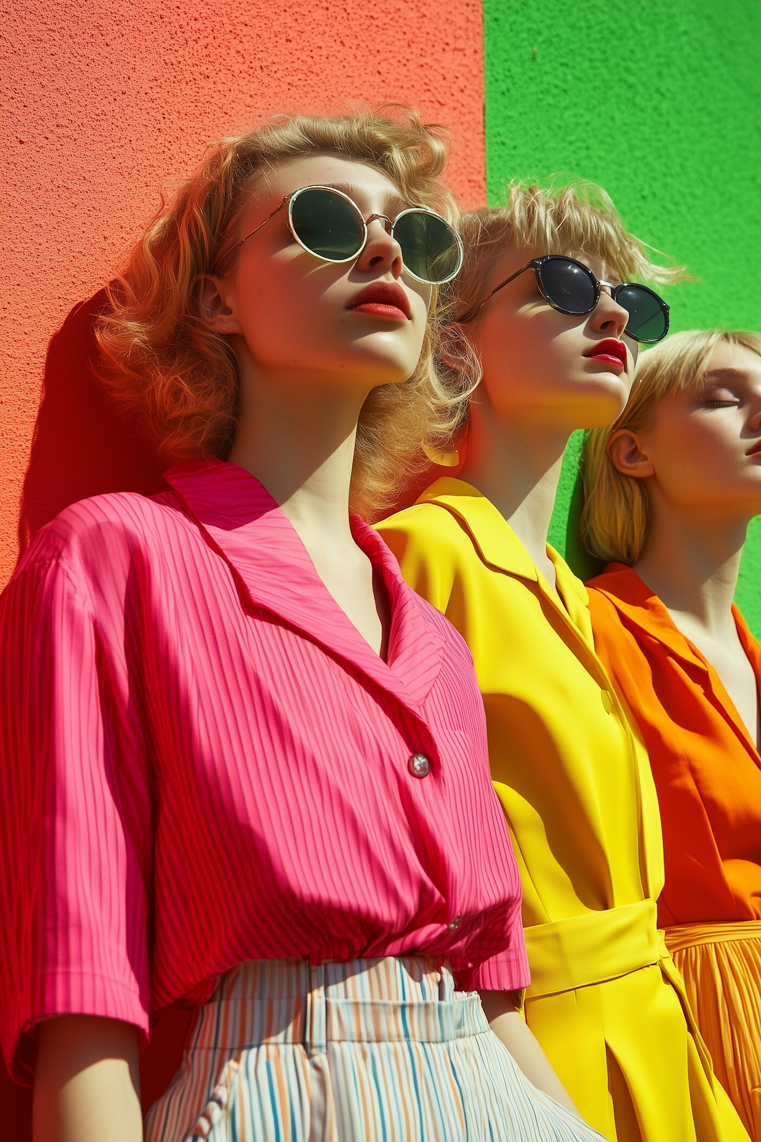 Three stylish women in bold pink, yellow, and orange outfits pose against a vibrant color-blocked wall under bright sunlight.