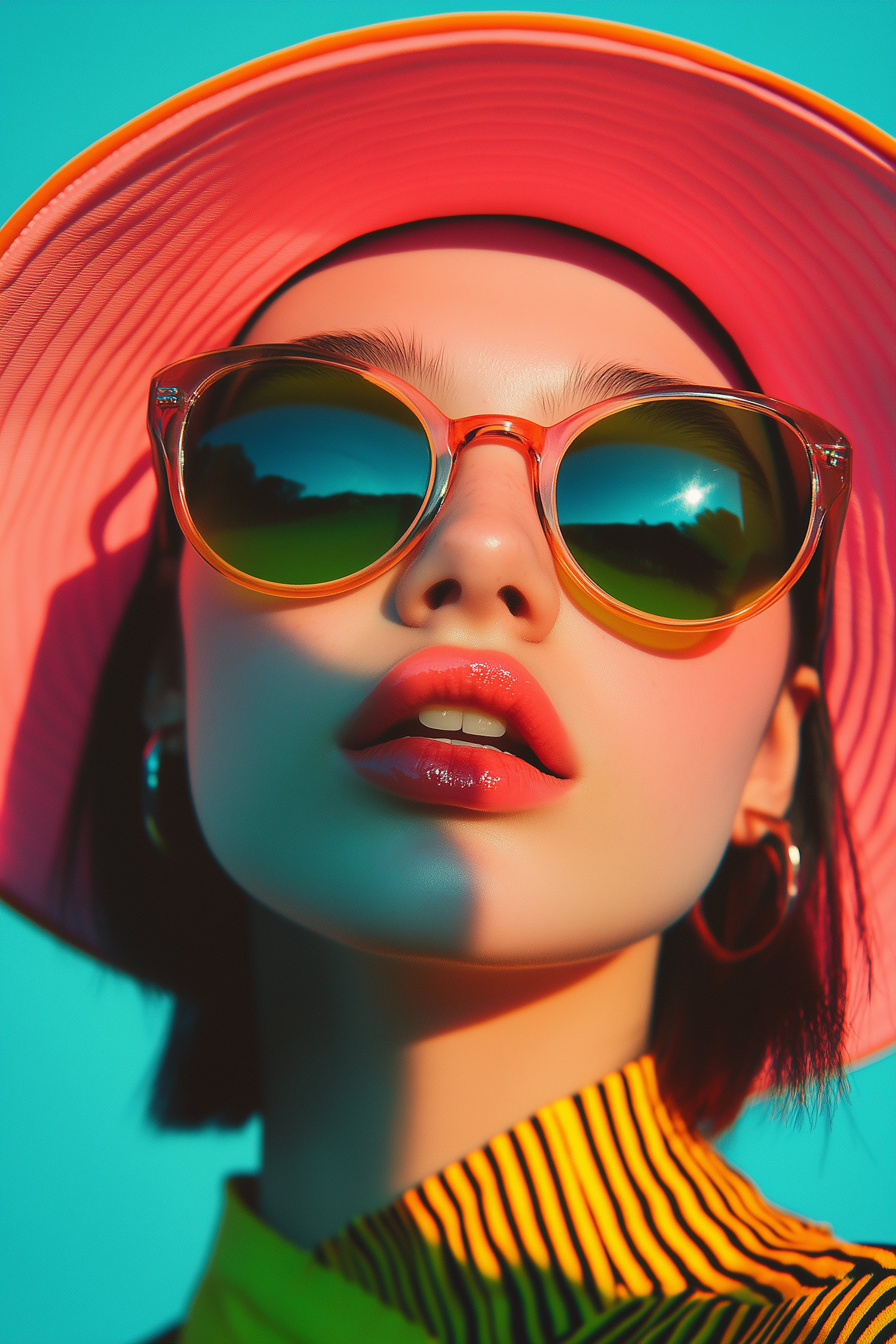 Vibrant close-up of a woman in reflective sunglasses, pink hat, and striped outfit against a turquoise background. Perfect summer vibes!