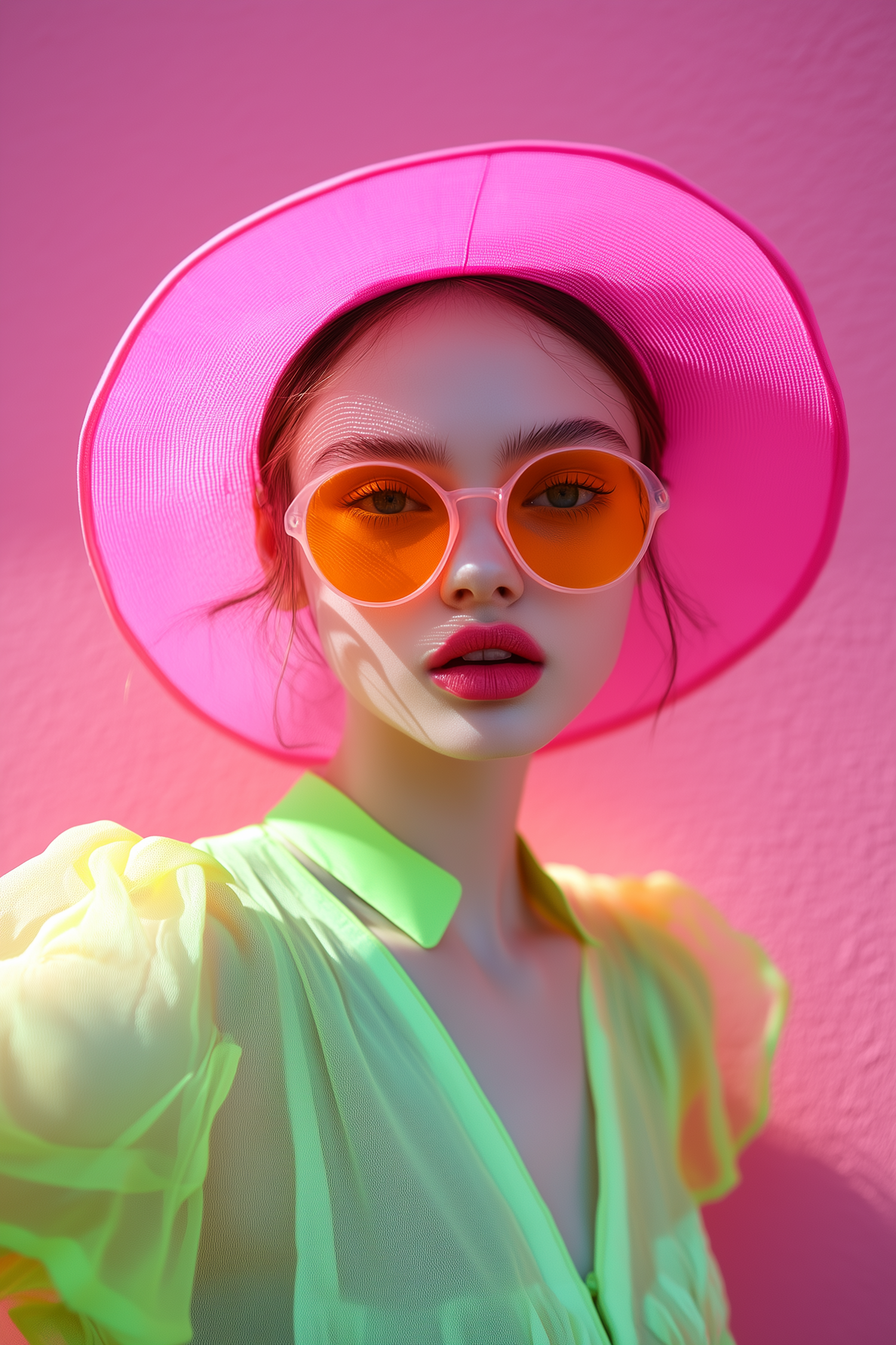 Vibrant portrait of a woman in a pink hat, orange sunglasses, and neon green blouse against a pink wall. Bold and colorful summer vibes.