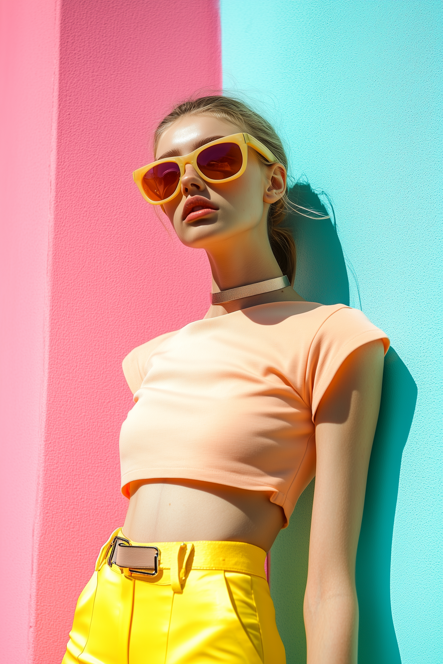 Stylish woman in yellow sunglasses, peach crop top, and yellow pants against a vibrant pink and turquoise background.