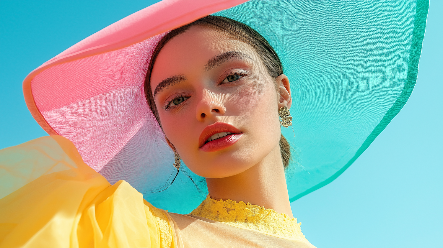 Bright and colorful portrait of a woman in a yellow outfit and a pink-turquoise hat against a clear blue sky.