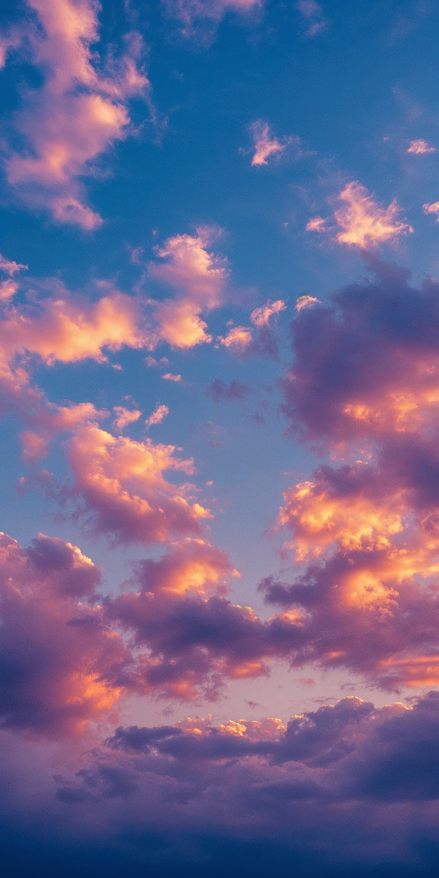 Vibrant sky with pink and orange clouds against a deep blue backdrop, creating a serene and dynamic sunset scene.