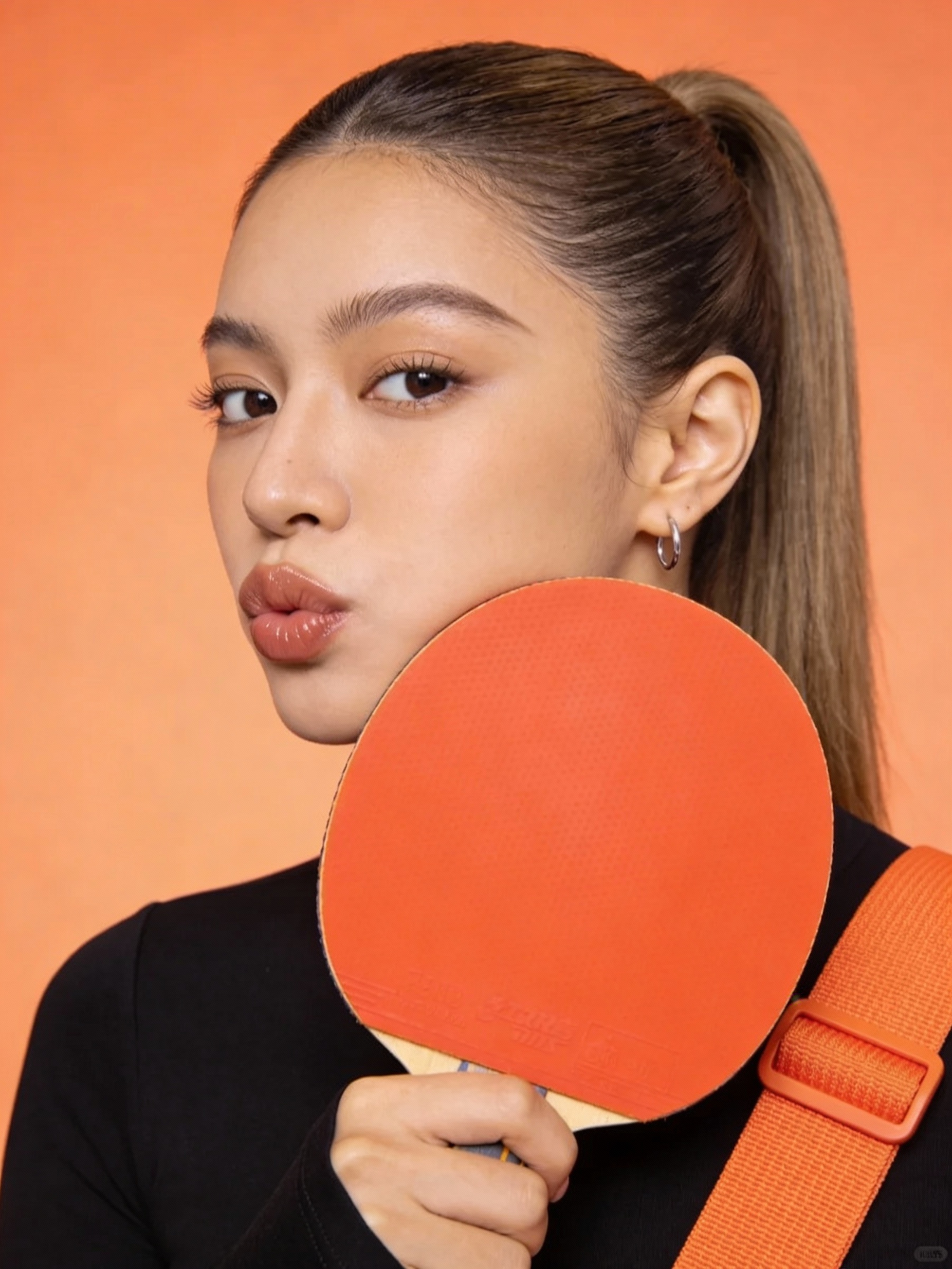Studio portrait, Gen-Z modern color-pop fashion editorial, female mid 20s; light olive skin, neutral undertone; sleek ponytail; glossy neutral lips; no freckles. Outfit: black fitted long-sleeve top with a tangerine nylon crossbody strap (bag mostly out of frame), no logos; accessory: tiny silver hoops. Prop: bright matte orange ping-pong paddle held near cheek. Solid tangerine seamless backdrop; Rembrandt lighting with soft fill; 105 mm macro-sharp. Expression: playful pout, eyes to camera.