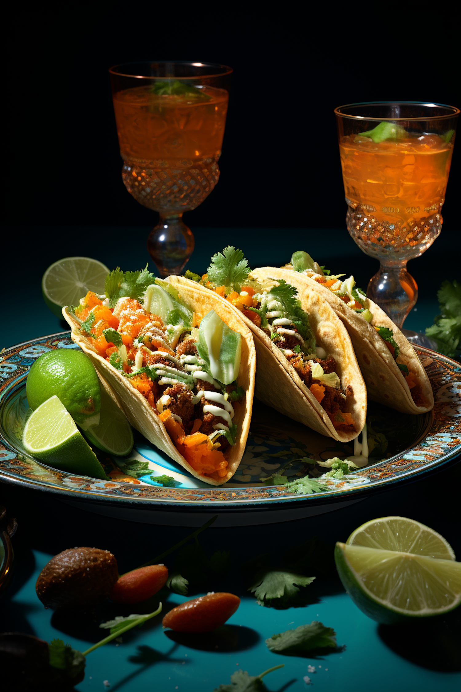 Delicious tacos with cheese, cilantro, and lime on a decorative plate, paired with refreshing orange drinks in elegant glasses.