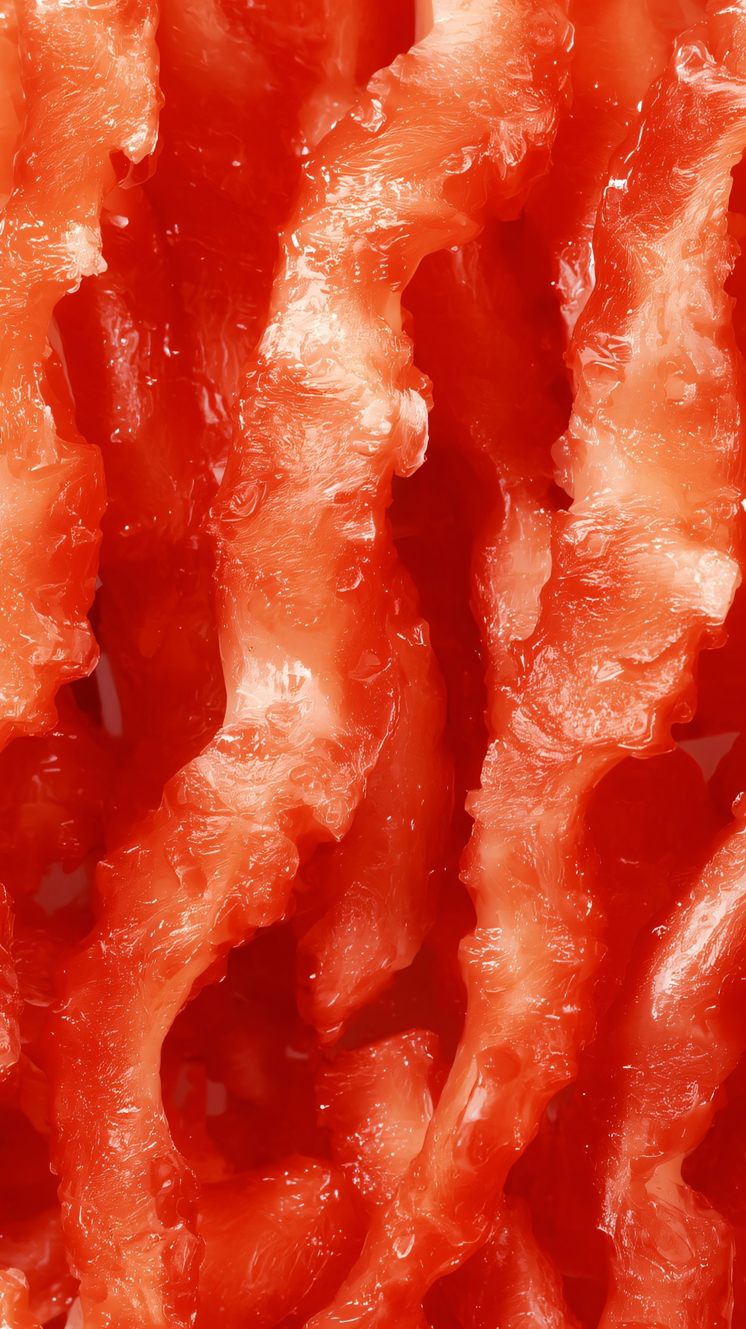 Close-up of a vibrant red textured surface with glossy, semi-translucent ridges and folds, creating an abstract and dynamic visual.