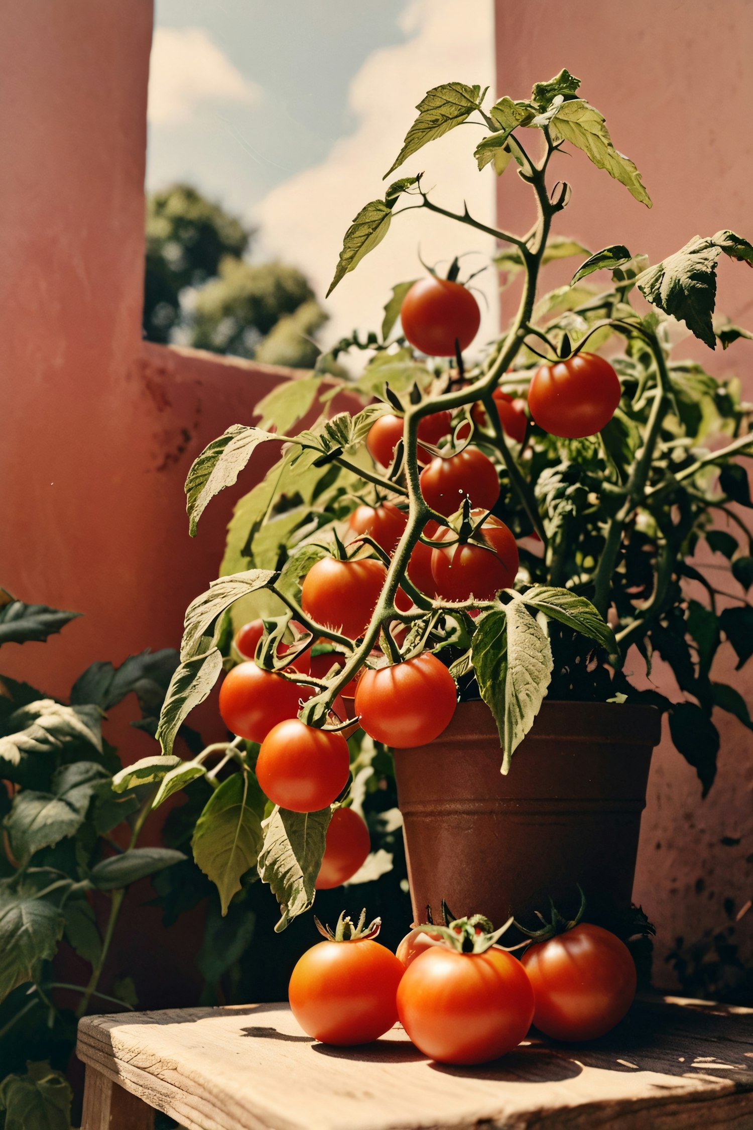 Lush tomato plant with ripe red tomatoes in a terracotta pot against a pink wall and blue sky, capturing a fresh garden vibe.