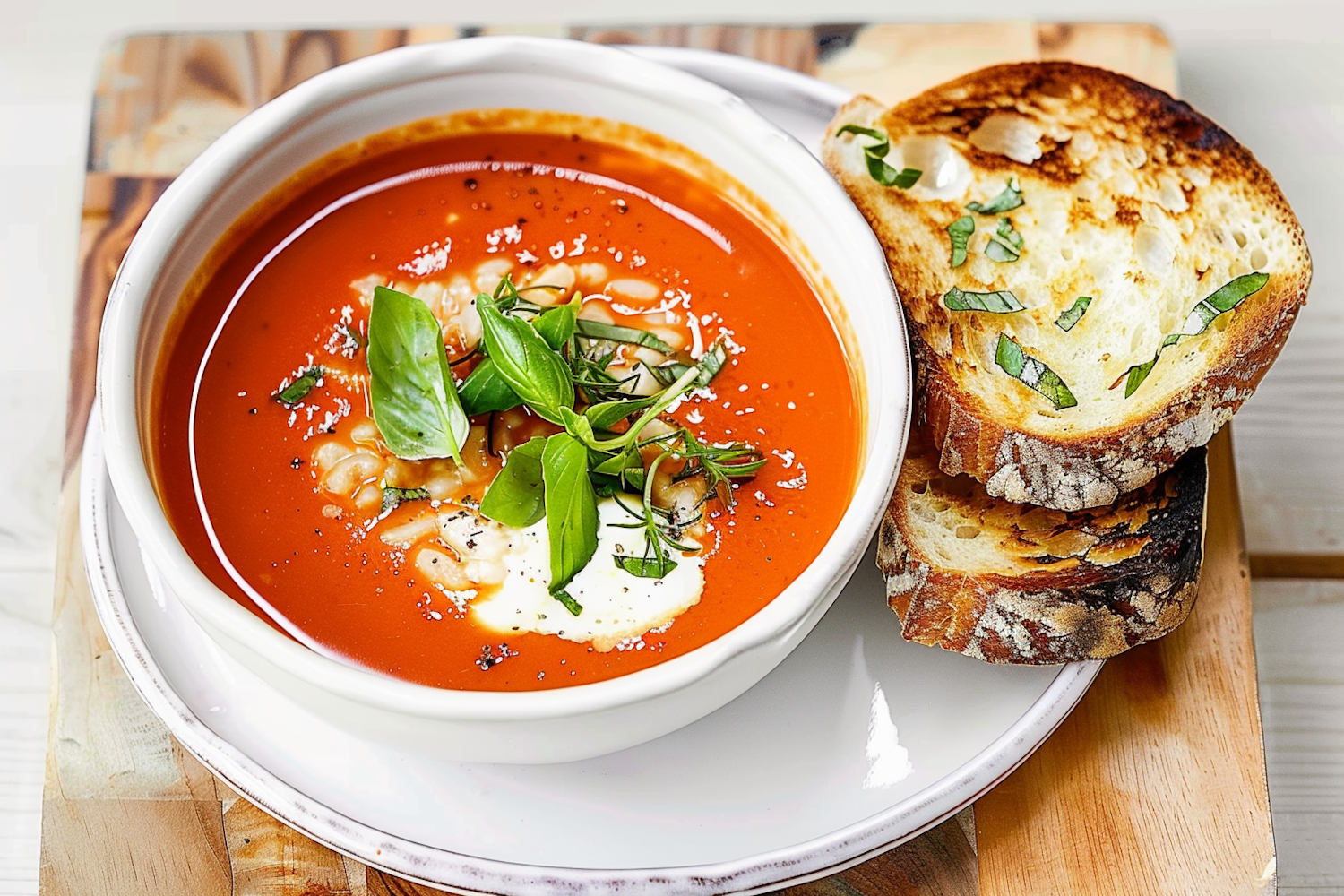 Vibrant tomato soup with basil and sour cream, served with crispy herb-topped toast. A rustic and elegant culinary presentation.