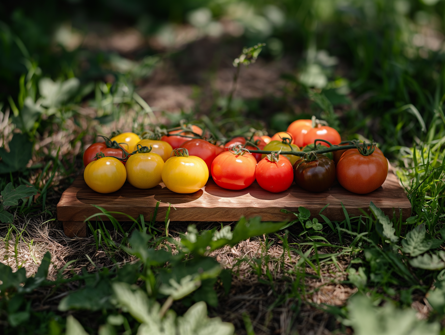 A variety of colorful tomatoes on a wooden board surrounded by lush green grass, showcasing fresh garden produce.