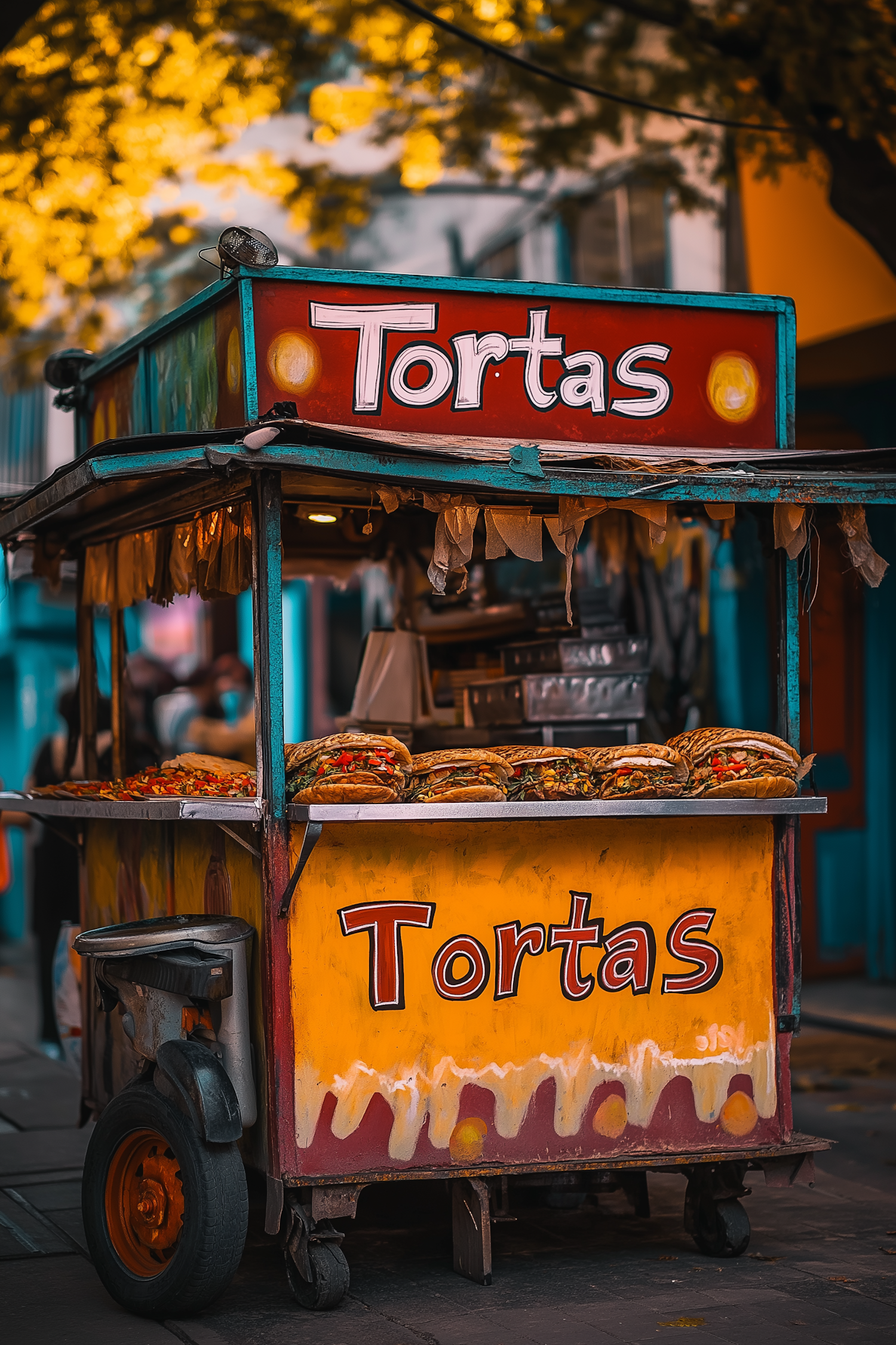 Colorful street food cart selling tortas with vibrant signage and delicious sandwiches in an urban setting.