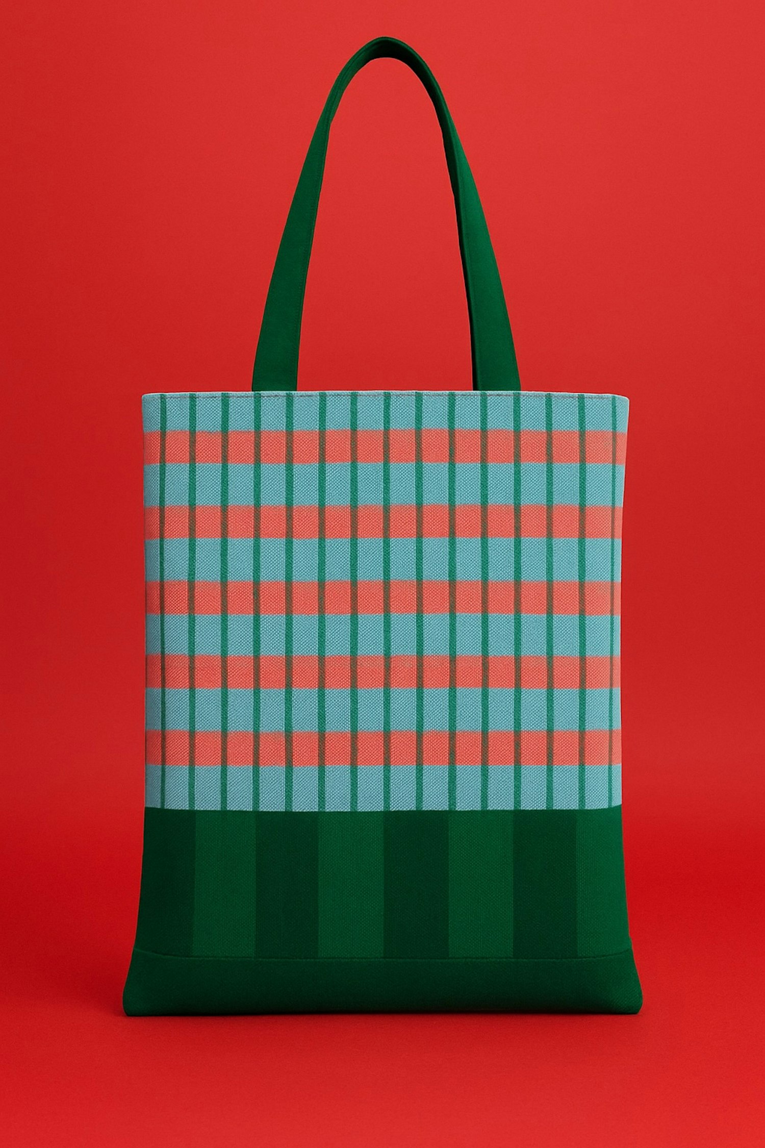 Stylish tote bag with a checkered blue and coral design, green accents, and handles, set against a bold red background.