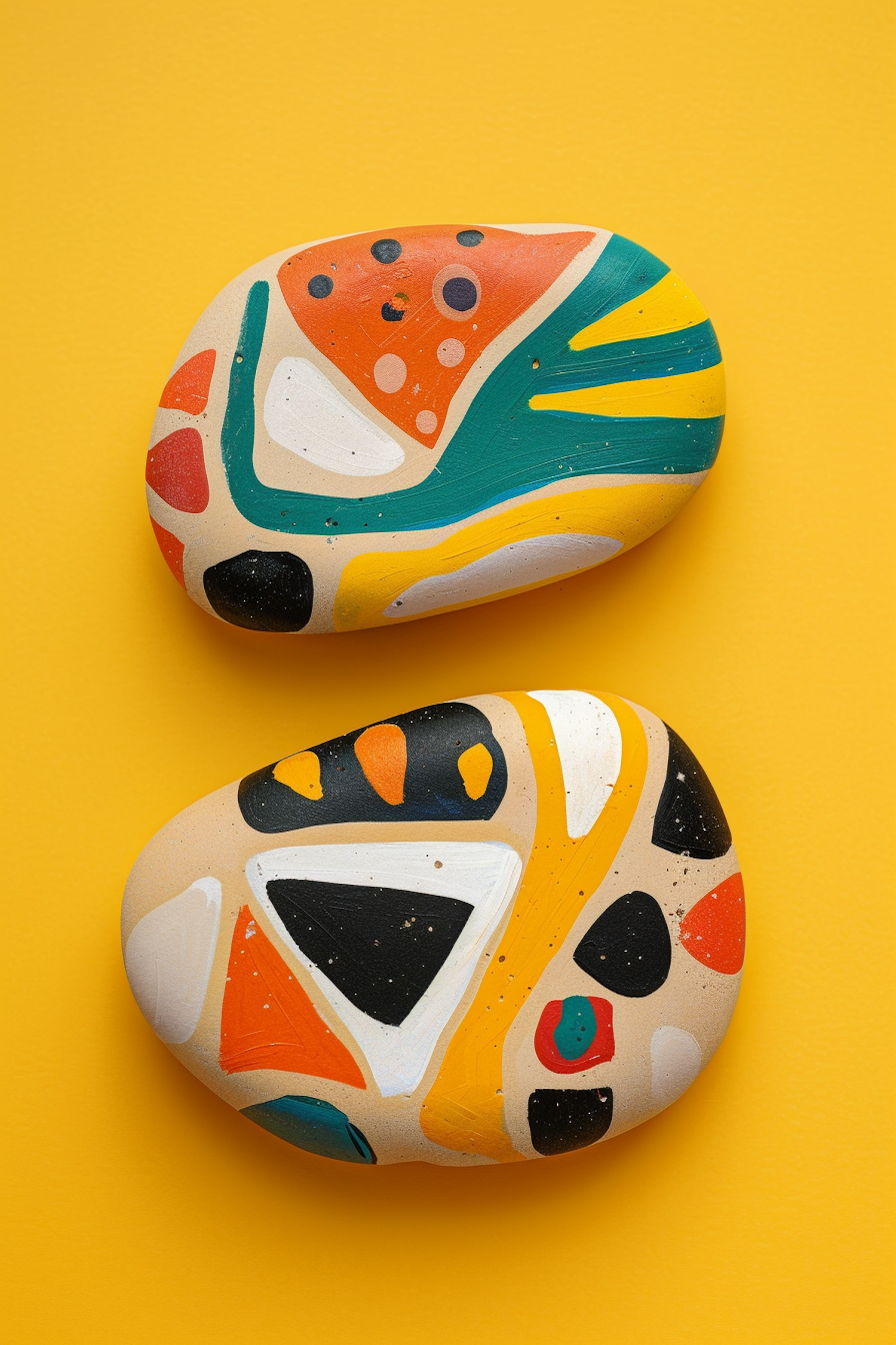 Colorful abstract painted stones on a vibrant yellow background, featuring geometric patterns in orange, teal, black, and white.