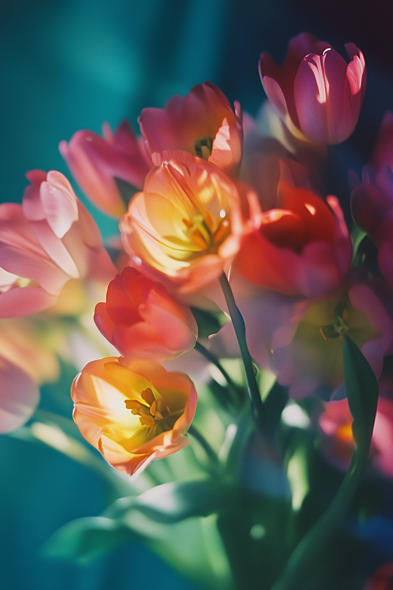 Vibrant tulips in pink, orange, and yellow bloom under soft light, creating a warm and inviting floral scene.