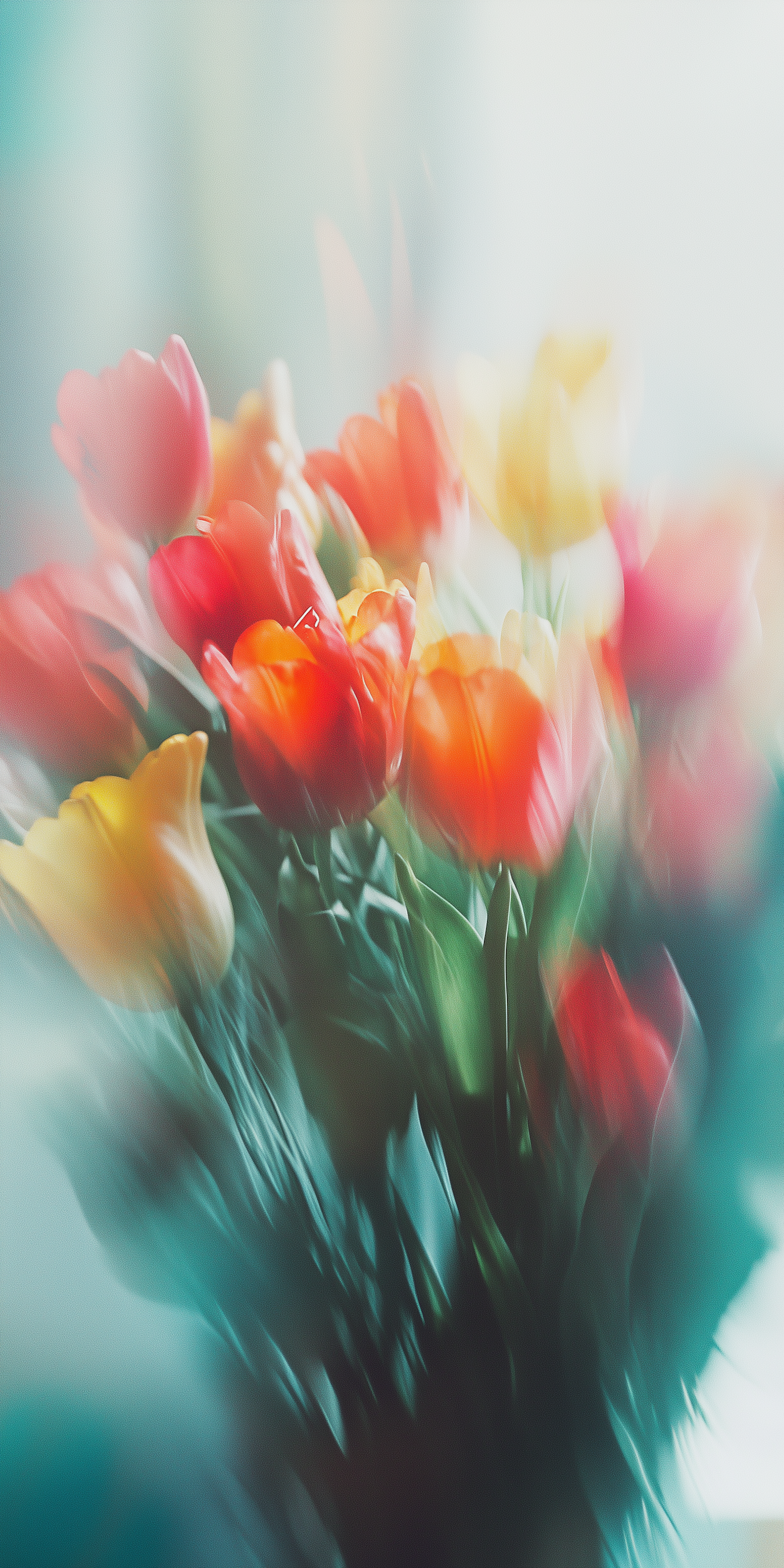 Dreamy bouquet of red, orange, and yellow tulips with a soft-focus effect, creating an ethereal and serene atmosphere.