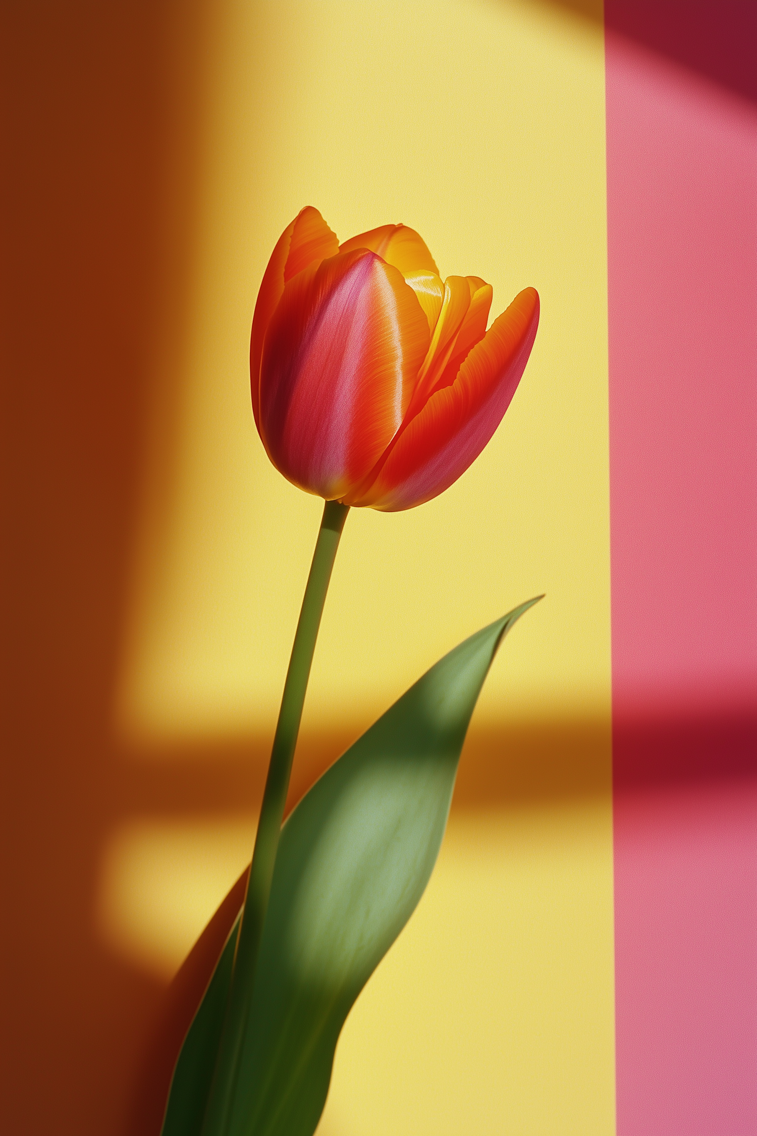 A vivid tulip with red and orange petals stands against a yellow and pink background, creating a striking and colorful composition.