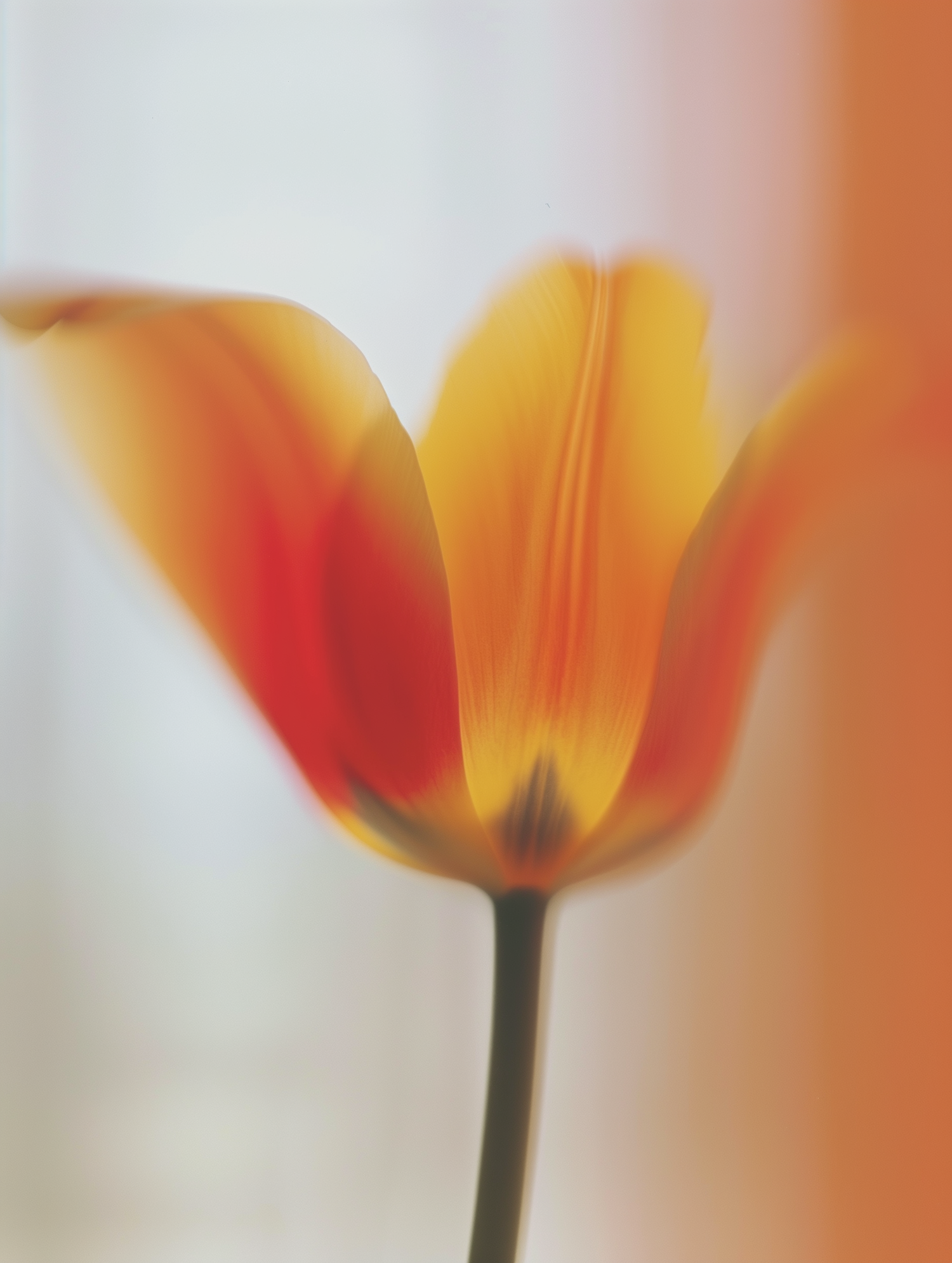 Close-up of a vibrant orange and red tulip with a soft, blurred background, highlighting its delicate petals and green stem.
